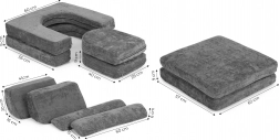 Această canapea modulară mare ECOTOYS oferă o combinație perfect echilibrată de confort, distracție și practică. Cele zece perne cu forme diferite permit construirea de sofa, șezlonguri și castele de joacă, astfel încât copiii pot să se odihnească și să creeze. Spuma moale, dar rezistentă, oferă susținere și siguranță în timpul jocului, în timp ce husa din chenille este plăcută la atingere și rezistă utilizării zilnice.