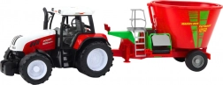 Tractorul roșu cu remorcă și malaxor mare de furaje reproduce fidel un utilaj agricol real. Datorită propulsiei prin împingere, vehiculul pornește singur, iar remorca atașată cu malaxor adaugă și mai mult realism jocului – copiii pot simula hrănirea animalelor și activitățile zilnice de la fermă.