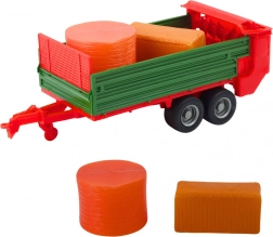 Remorcă verde cu două axe și platformă deschisă, ideală pentru încărcarea și transportul baloților de fân în scenarii de fermă.