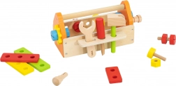 Cutia portabilă practică păstrează toate piesele laolaltă. Copiii pot asambla, înșuruba și bate cu ciocanul cu ușurință – acasă sau în călătorii.