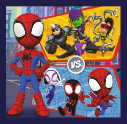 Set de puzzle pentru copii 3‑în‑1 cu motive Spidey, păianjeni și dinozauri, oferă trei imagini cu 20, 36 și 50 de piese. Grozav pentru dezvoltarea logicii, răbdării și motricității fine. Fiecare puzzle asamblat are dimensiunea de aproximativ 20 × 19,5 cm.
