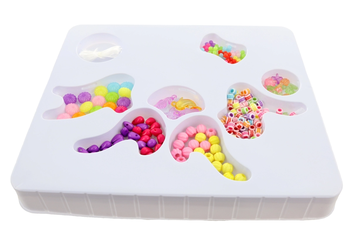 Cutia este clar compartimentată și practică pentru depozitare, astfel încât mărgelele se sortează și se transportă ușor. Datorită formelor și culorilor diverse, copiii creează brățări, coliere și alte accesorii originale.