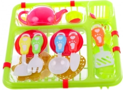 Setul de ceai din plastic pentru copii, cu picurător practic, îi va încânta pe micii și micile bucătari. Conține un ceainic cu capac, ceșcuțe, farfurioare, un bol și accesorii mici precum lingurițe. Ideal pentru joaca de-a casa, dezvoltă imaginația și motricitatea fină. Ambalaj compact, aproximativ 26 × 26 × 6 cm. Vârsta 3+.