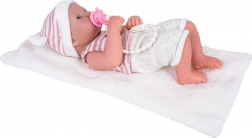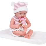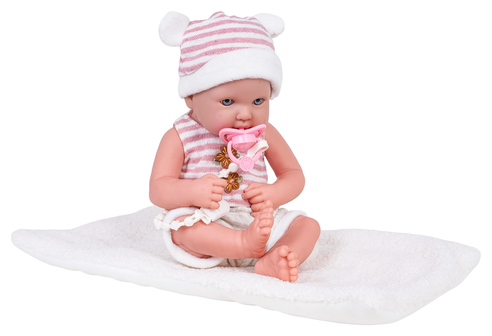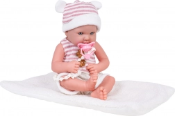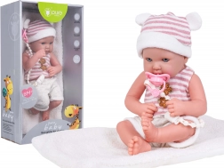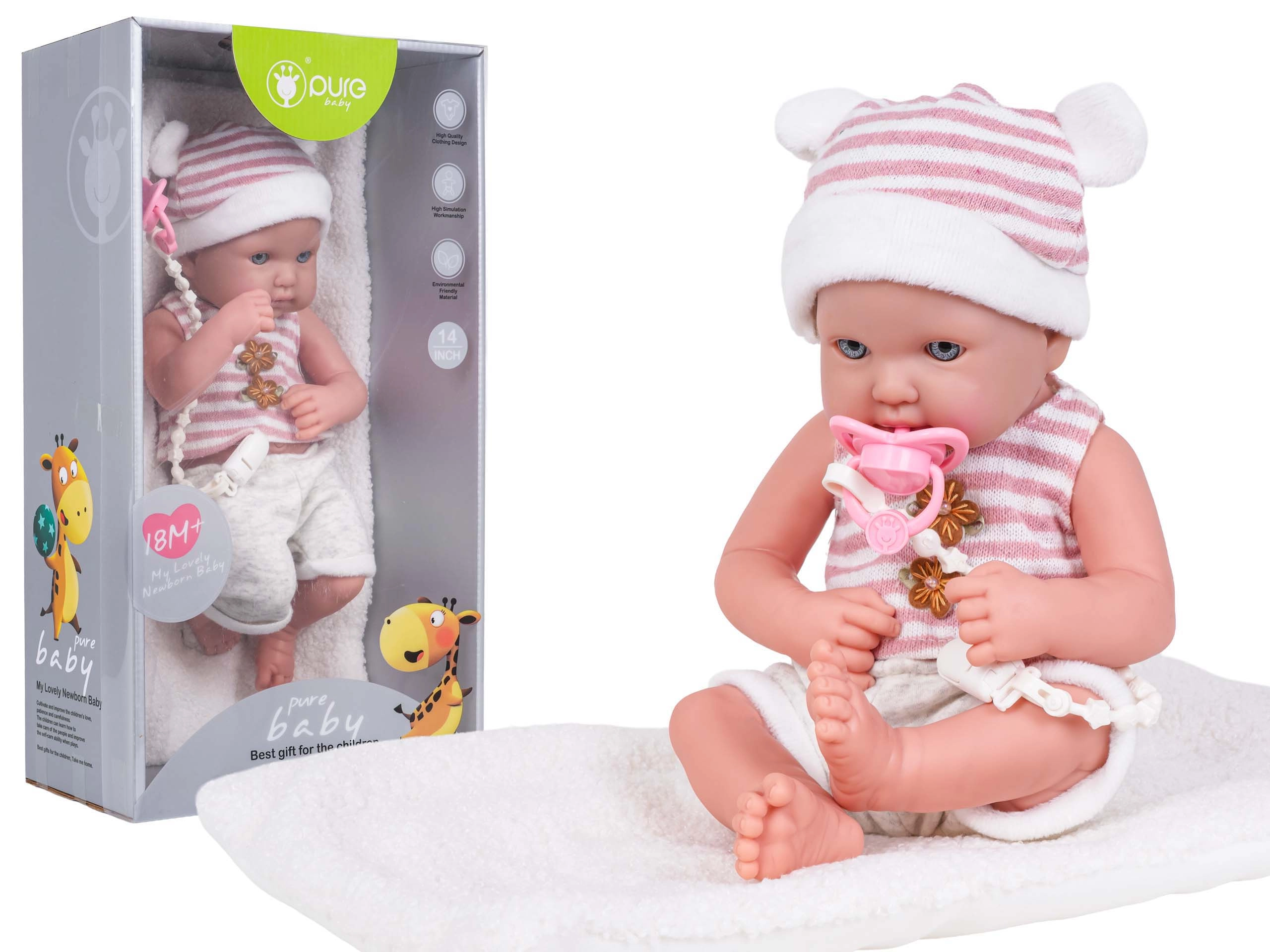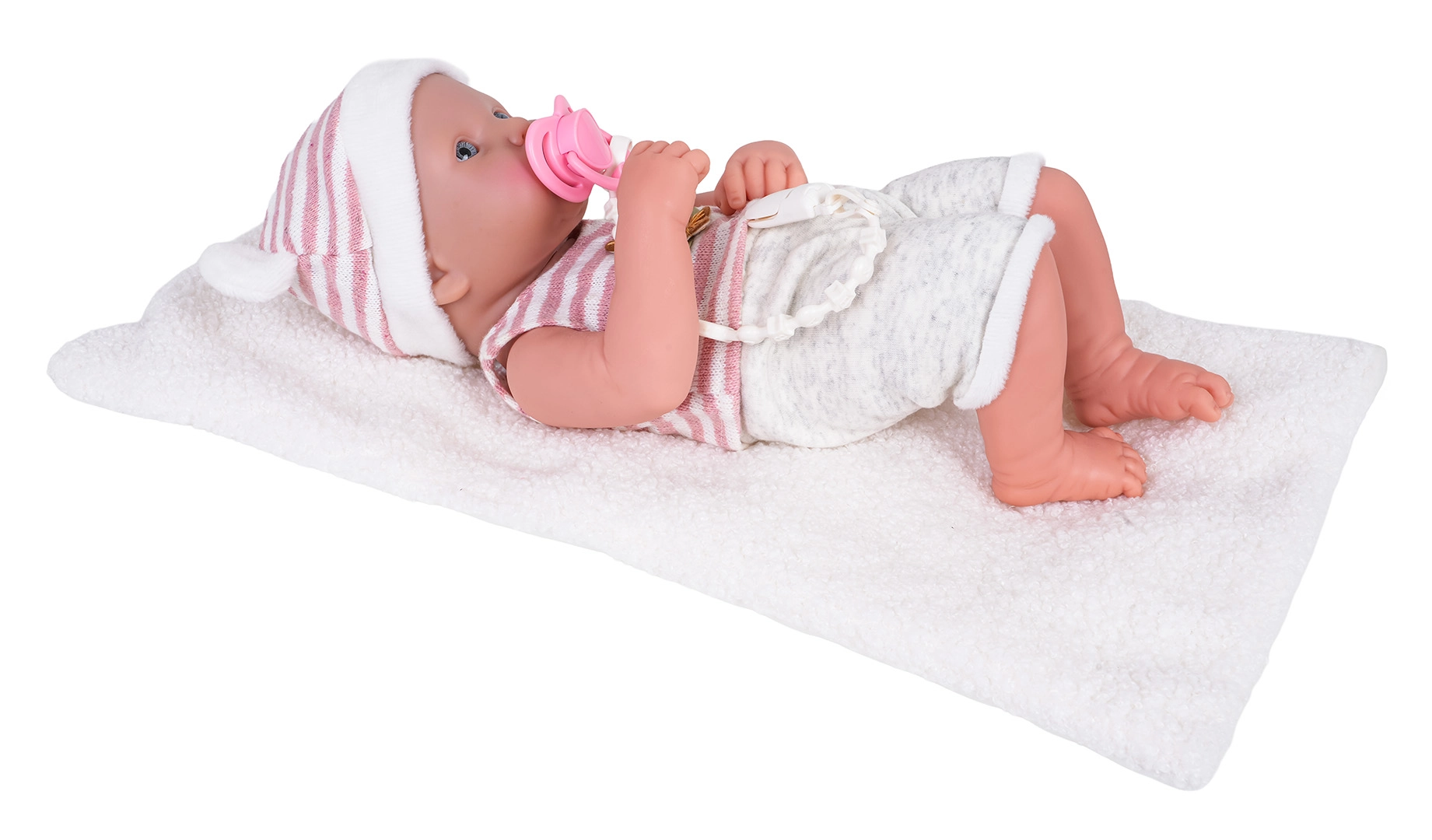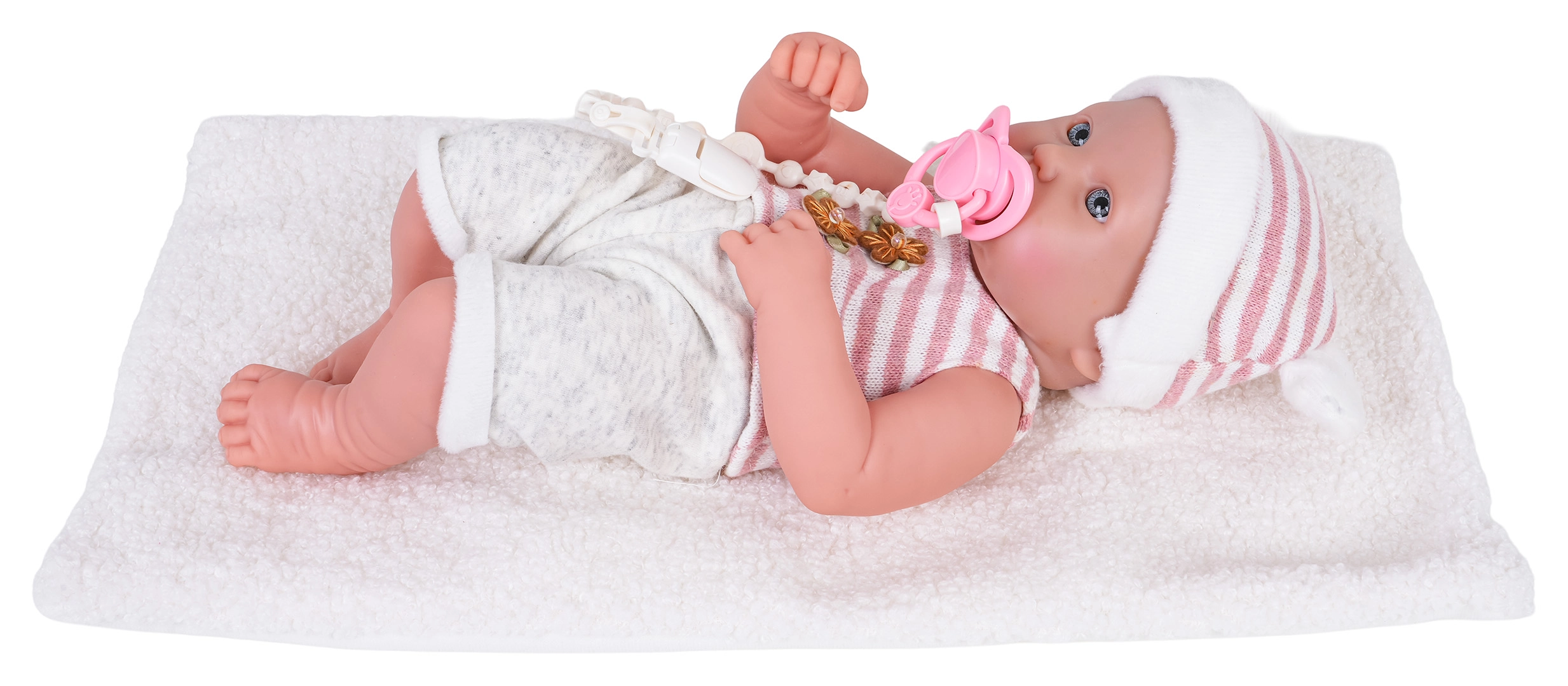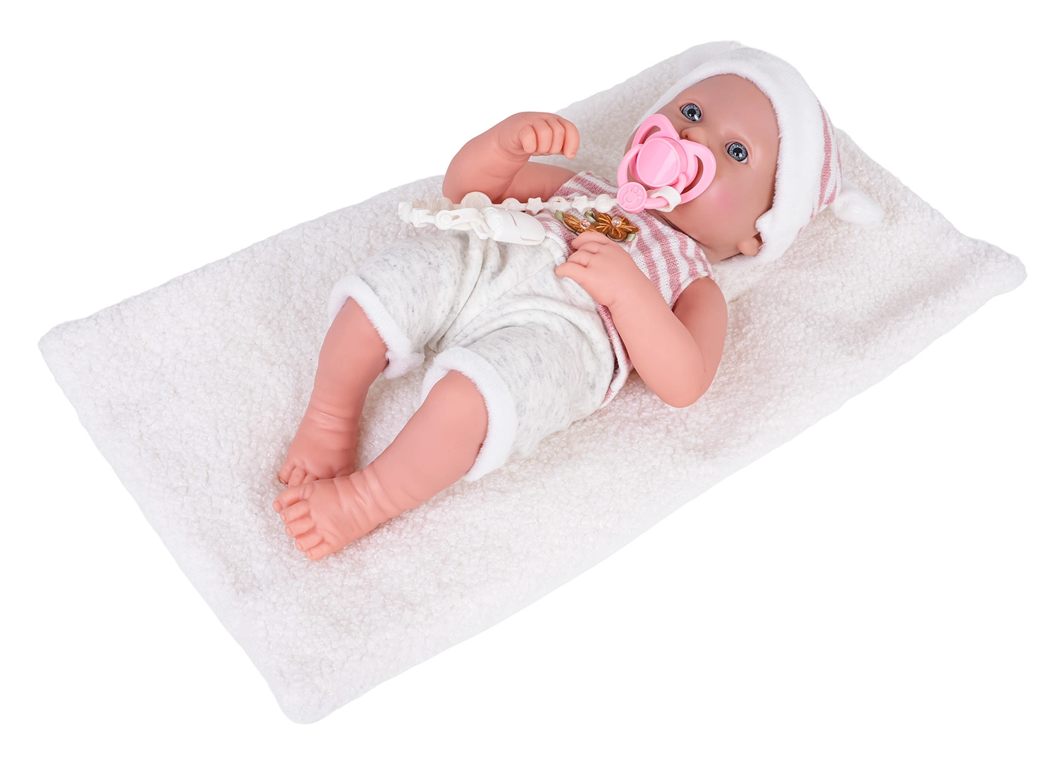 În pachet găsiți tot ce au nevoie copiii pentru joacă: suzetă pe șnur pentru liniștirea bebelușului și pătură moale pentru înfășat sau adormit. Păpușa este potrivită de la 3 ani, are haine ușor de scos (căciuliță, bluză și pantalonași scurți) și se întreține ușor.