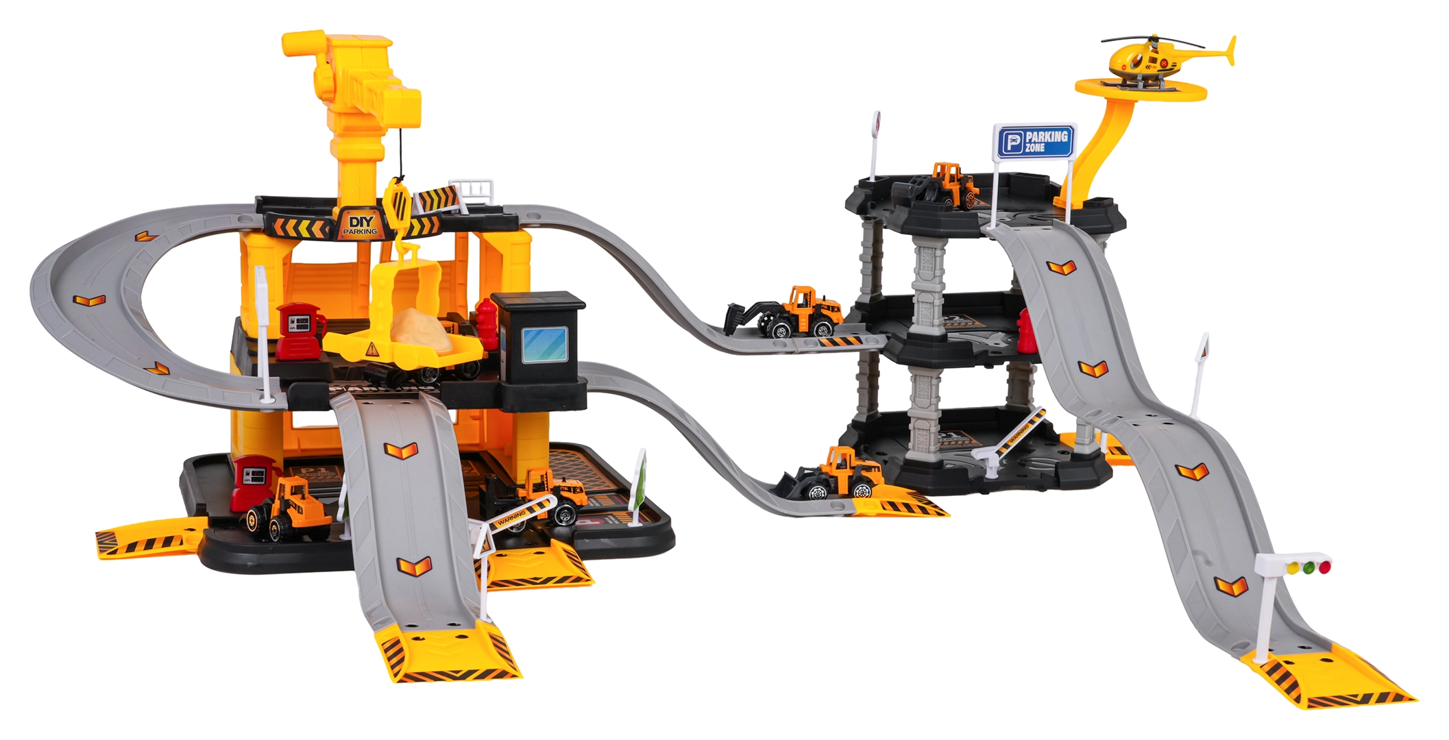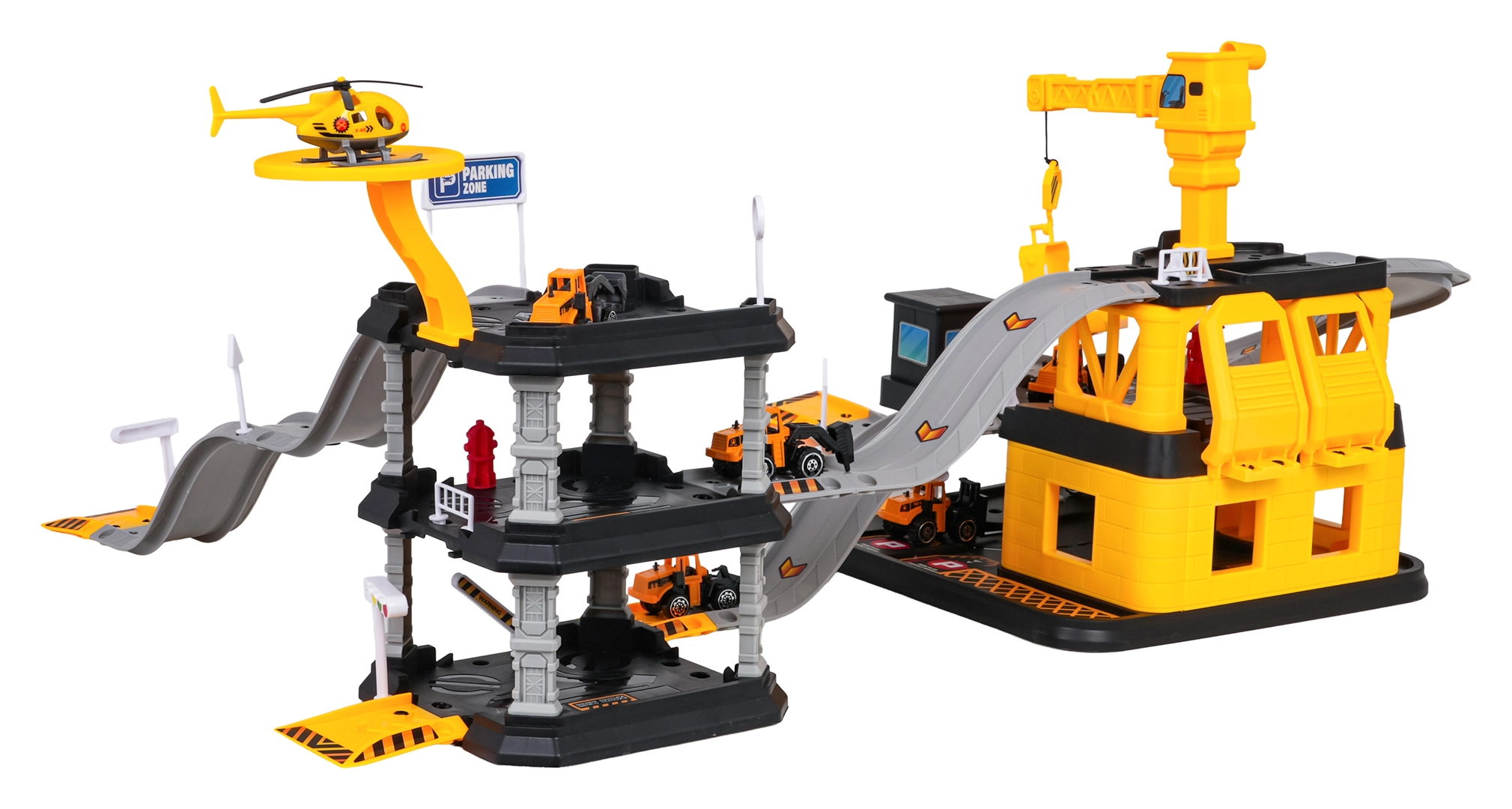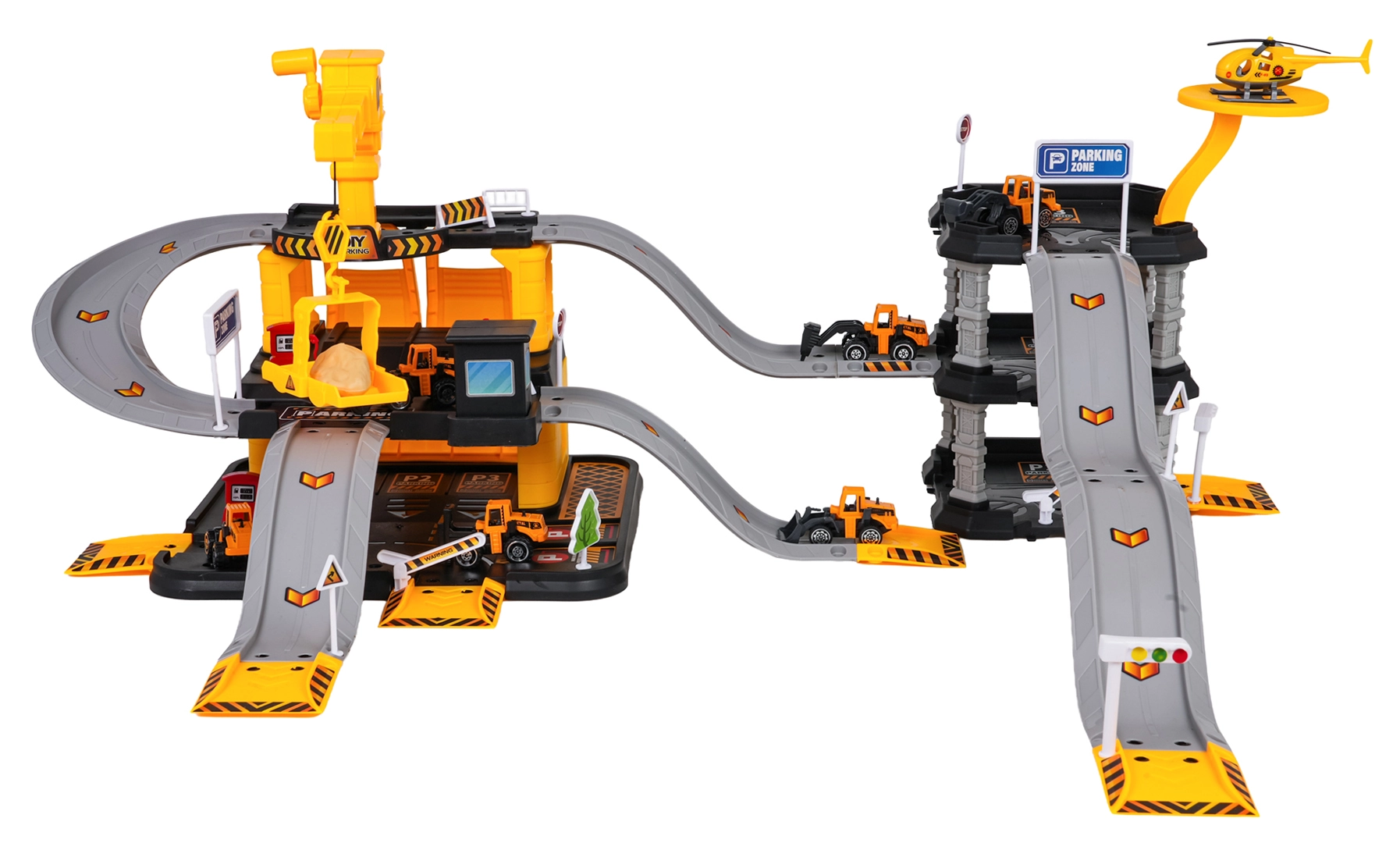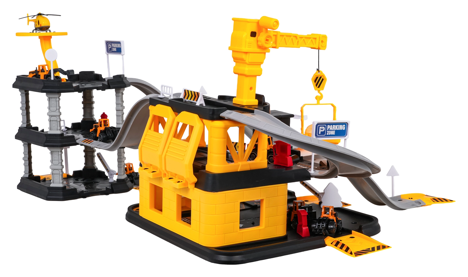 Parcarea pe trei etaje cu heliport este conectată la un șantier pe trei etaje cu rampe și macara. Copiii pot circula fluent între zone și pot crea propriile scenarii de construcție.