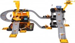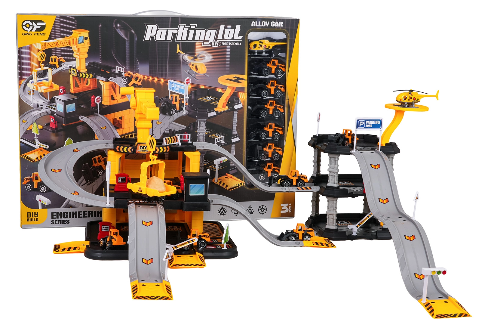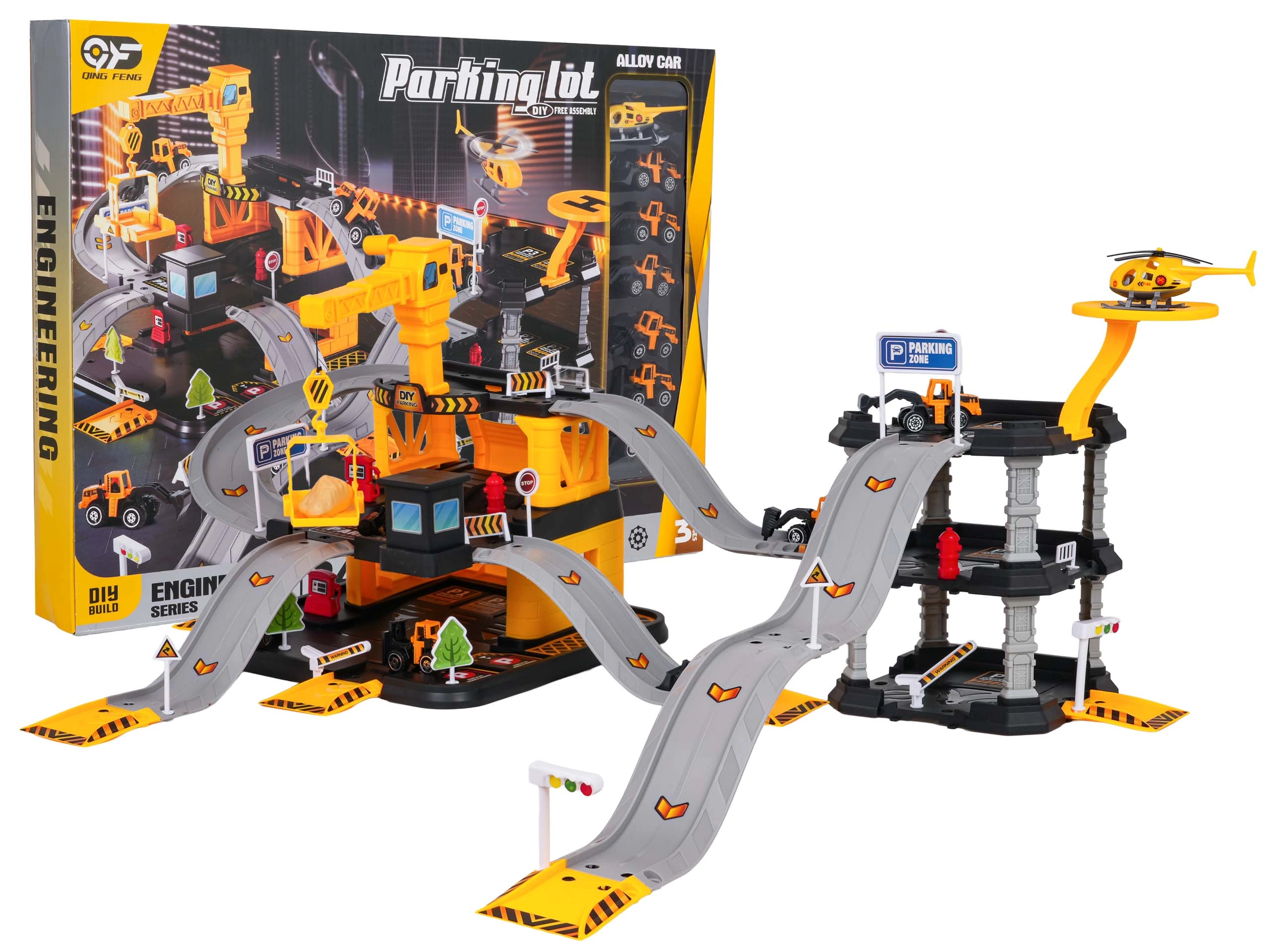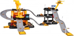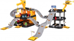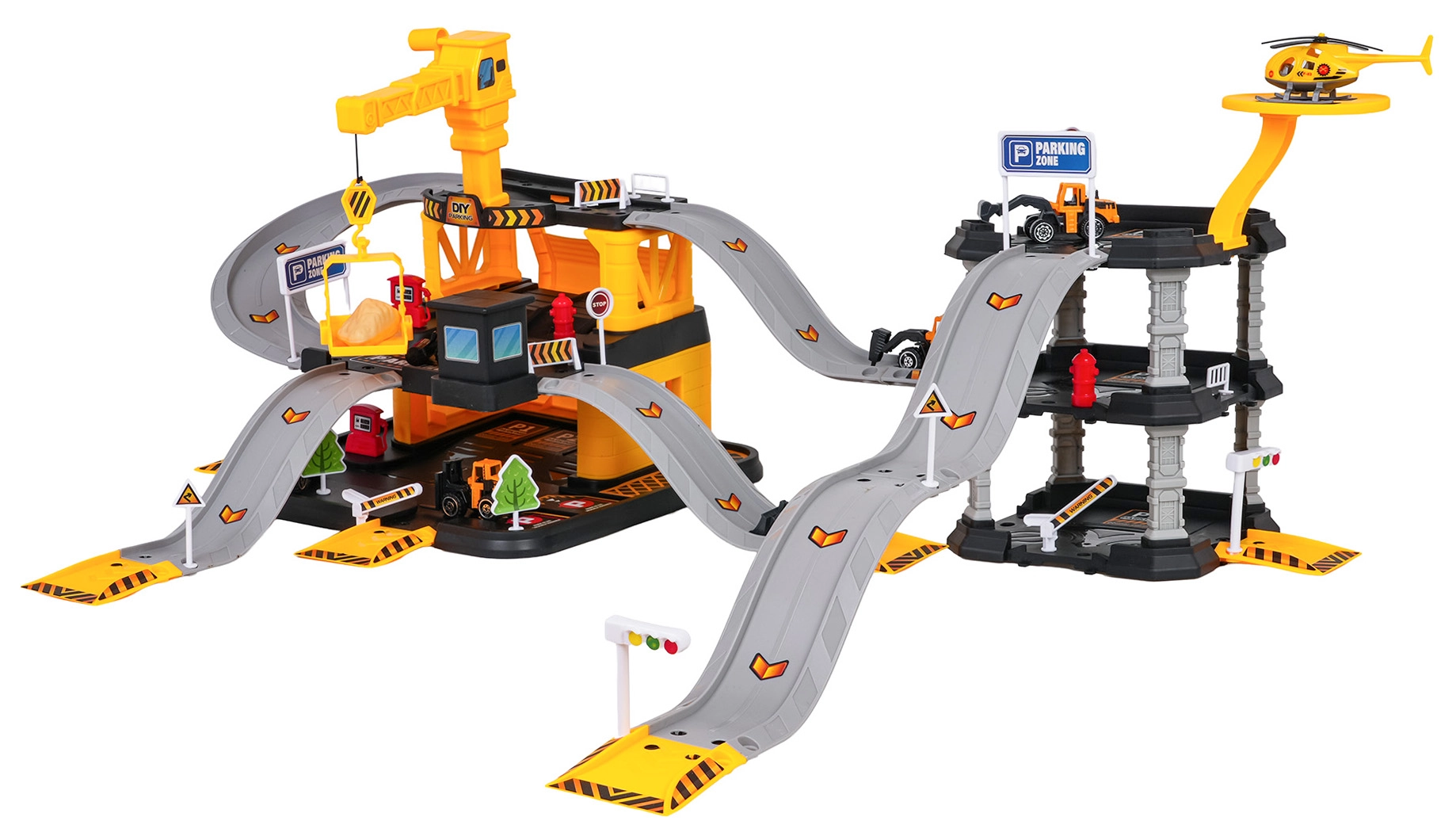 Parcarea pe trei etaje cu heliport este conectată la un șantier pe trei etaje cu rampe și macara. Copiii pot circula fluent între zone și pot crea propriile scenarii de construcție.