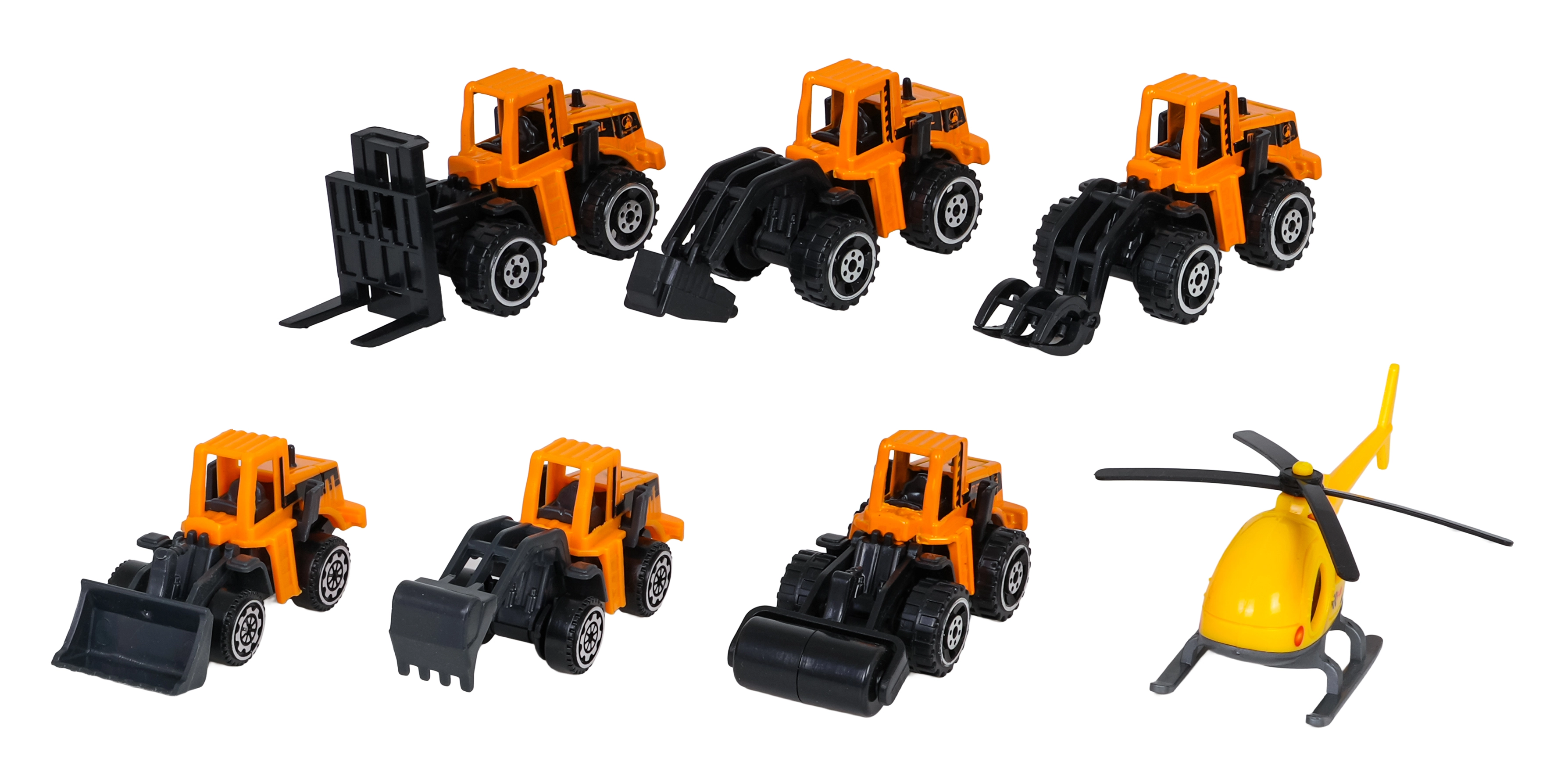 Stivuitor, ciocan pneumatic, încărcător frontal, compactor (rulou), vehicul cu lamă, excavator și elicopter galben. Caroserii metalice și piese mobile pentru un joc și mai realist.
