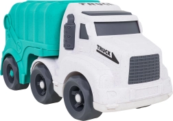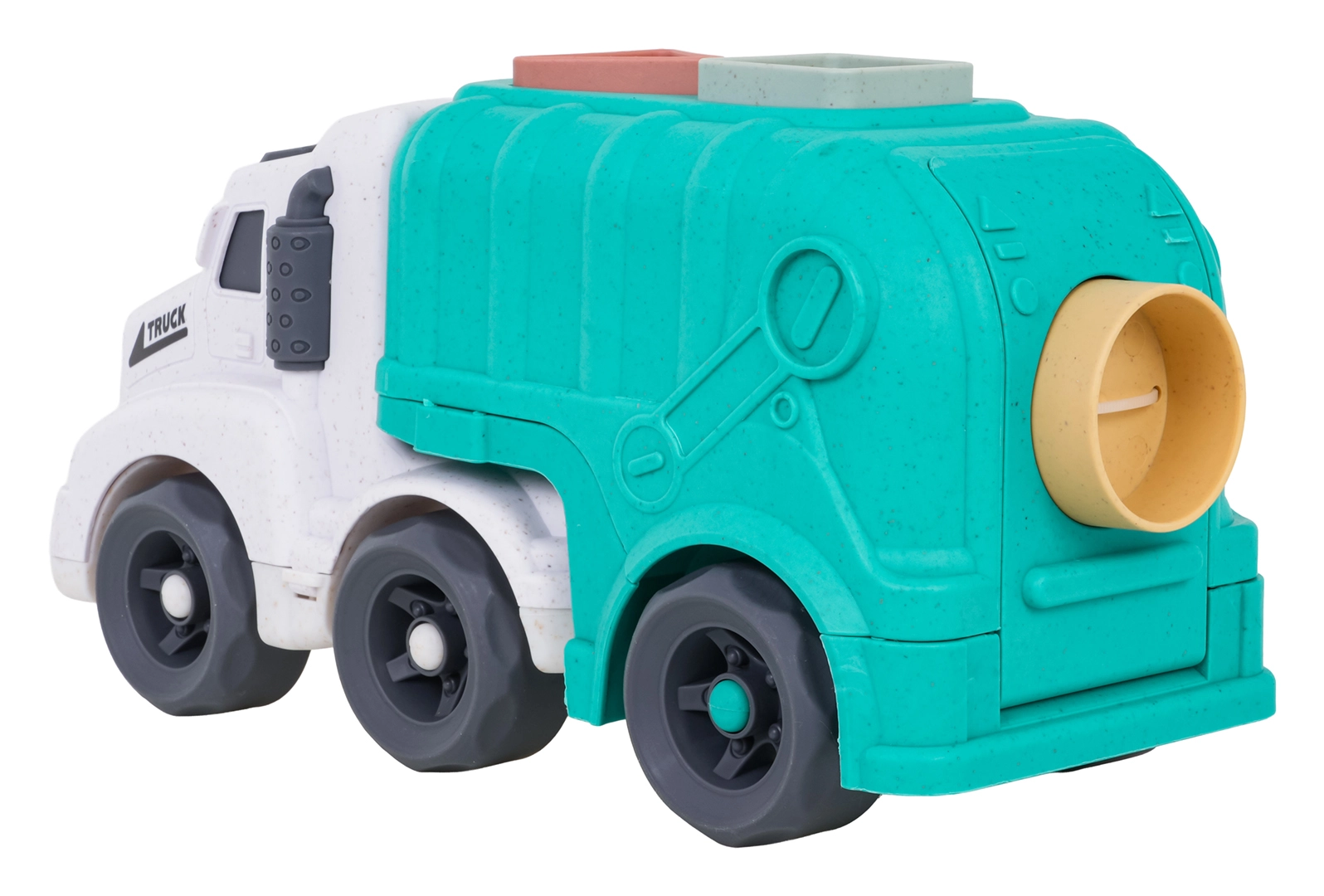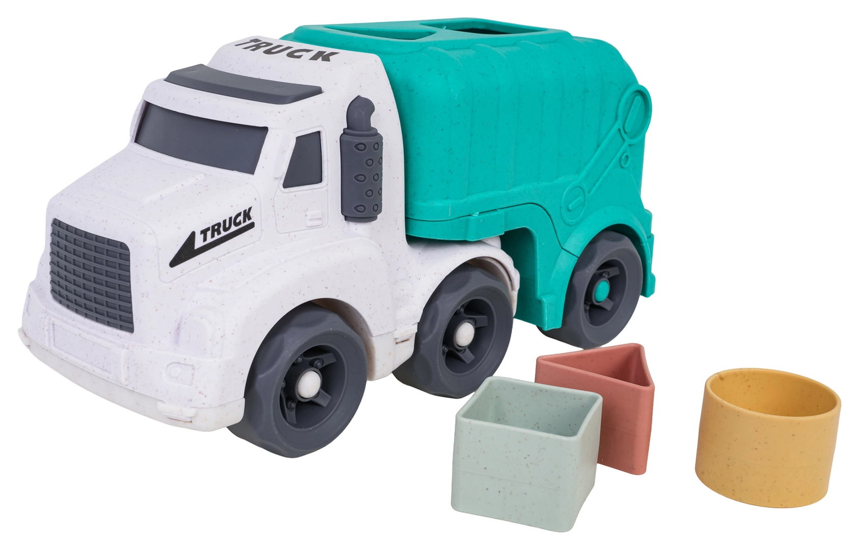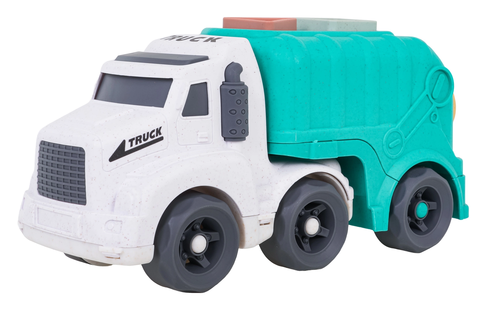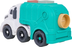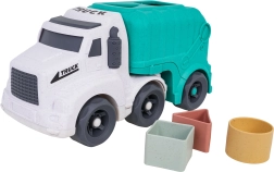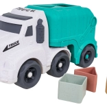 Descoperiți o jucărie distractivă și sustenabilă pentru cei mici – camionul de gunoi realizat din bioplastic de calitate. Datorită sortatorului de pe acoperiș și de pe clapeta din spate, copiii exersează recunoașterea formelor și culorilor, în timp ce roțile mobile încurajează jocul dinamic și creativ. Trapa spate rabatabilă permite acces rapid la cuburi și reluarea ușoară a jocului.