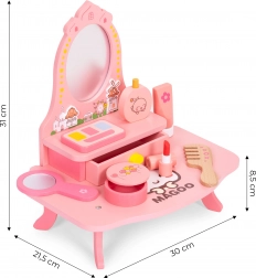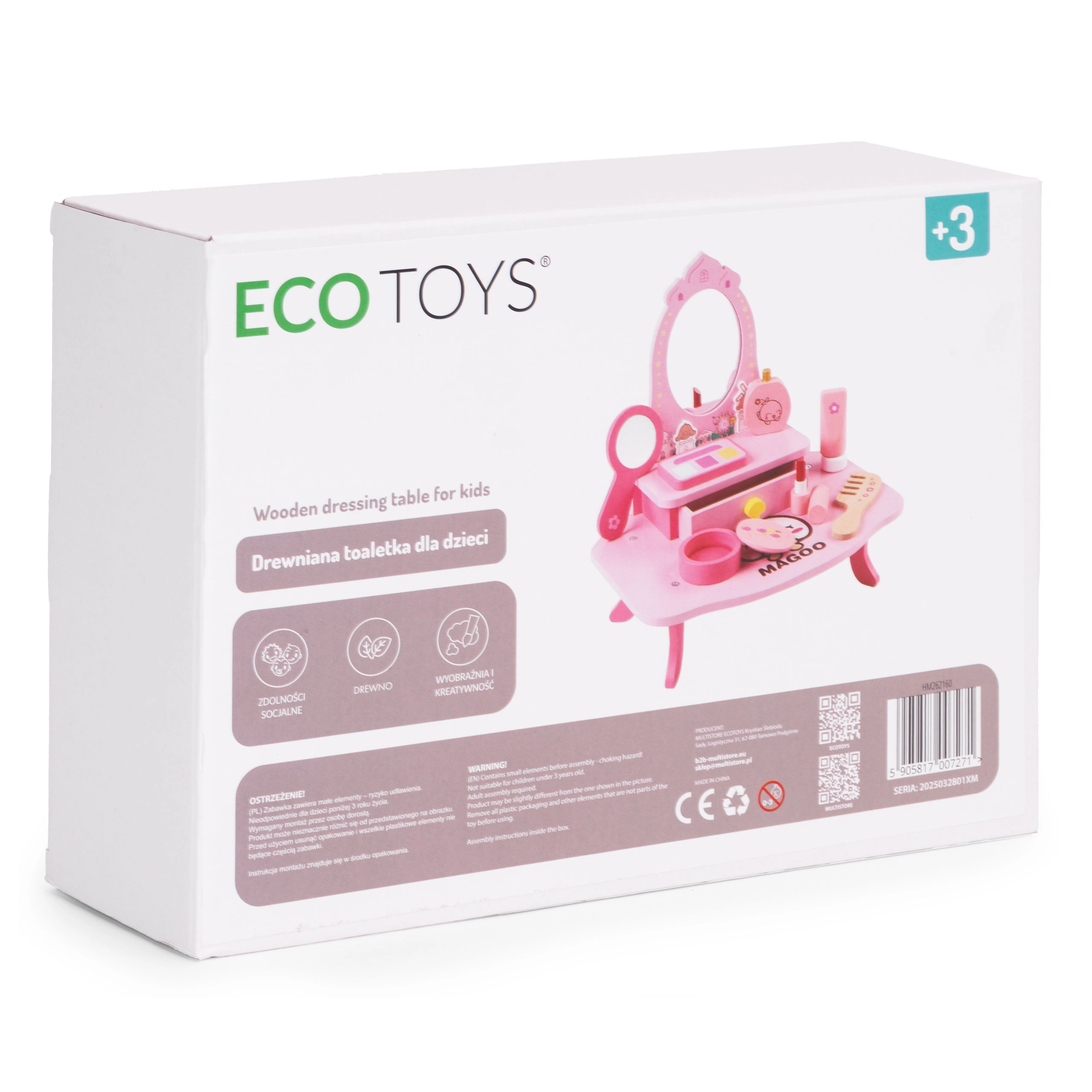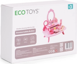 Oferiți-le copiilor propriul colțișor creativ – măsuța de toaletă ECOTOYS, în roz pal, se potrivește frumos în camera copilului și invită la joc de rol. Cei mici exersează în siguranță ritualurile zilnice, învață să mențină ordinea datorită sertarului și își dezvoltă abilitățile manuale și încrederea în sine.