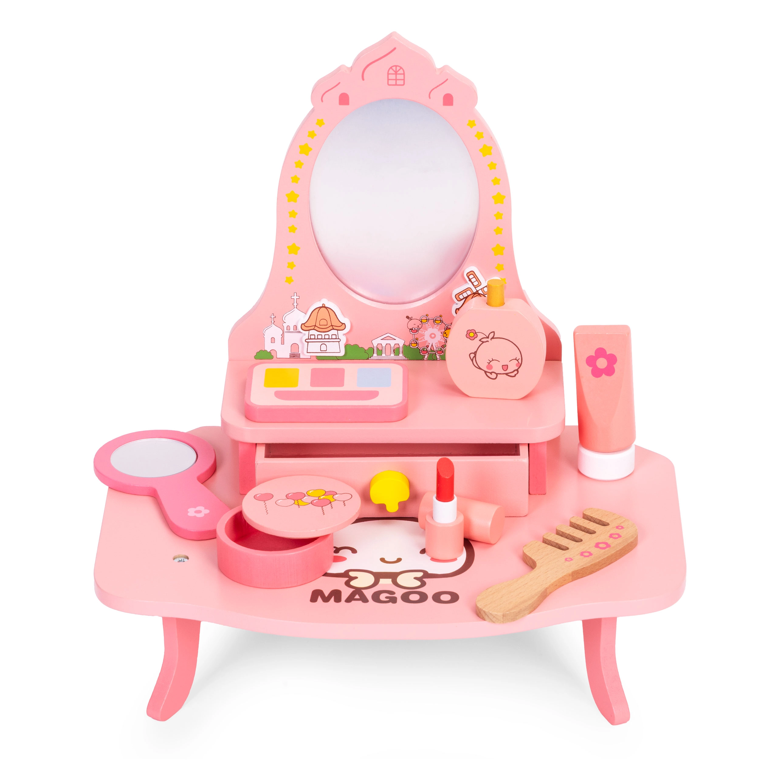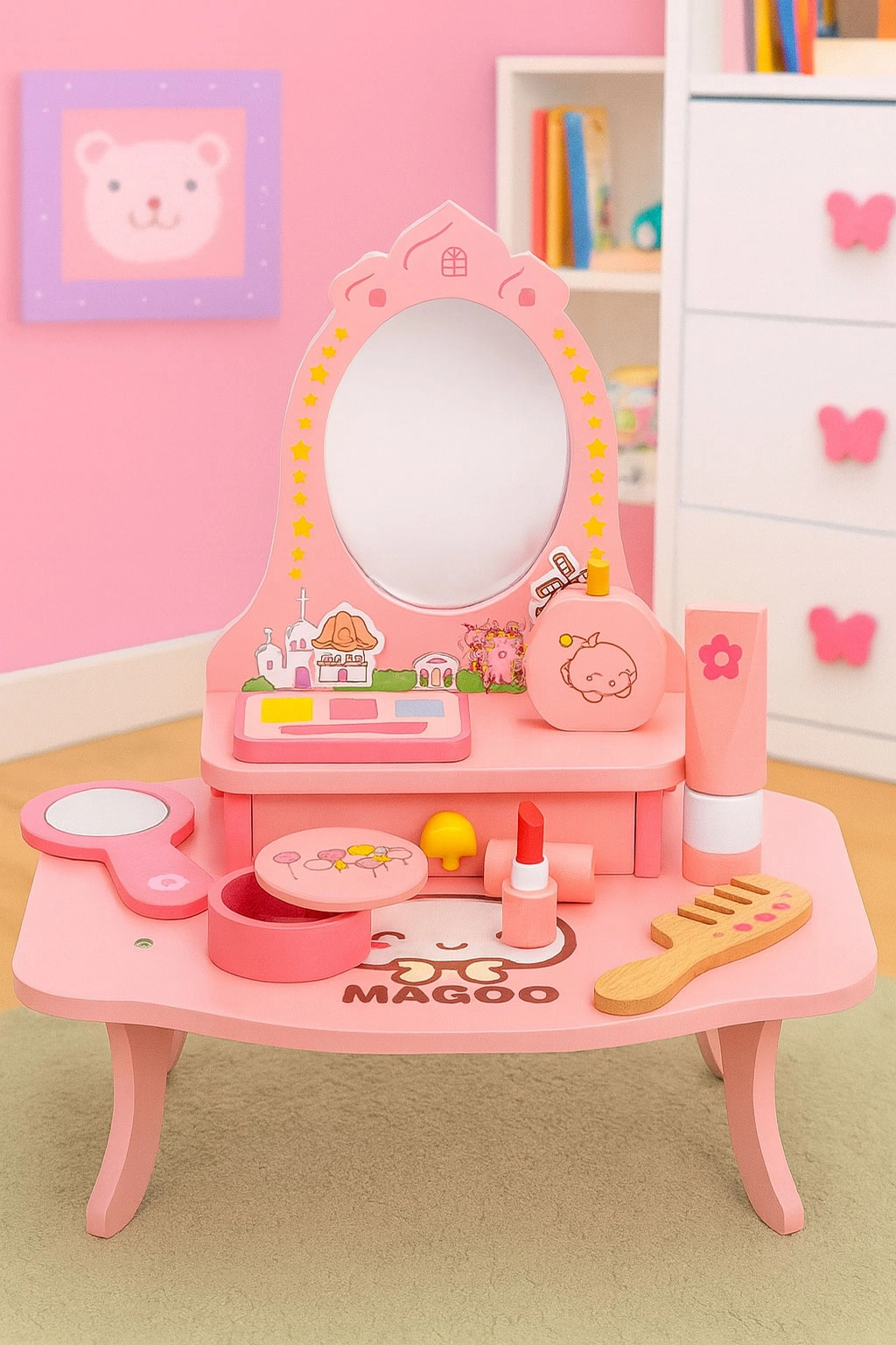 Oglinda decorativă cu forme rotunjite are un aer de basm și încurajează aranjarea și jocul de „salon de frumusețe”. Sertarul practic ascunde toate accesoriile – de la pieptăn până la ruj – pentru ca totul să fie mereu la îndemână și ordonat.