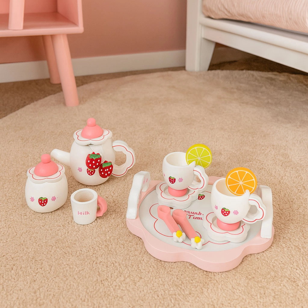Descoperiți farmecul timpului pentru ceai cu setul din lemn ECOTOYS inspirat de adorabilul motiv cu căpșuni. Setul reproduce realist servirea adevărată – de la ceainic și zaharniță până la felii de lămâie și portocală. Toate piesele sunt din lemn de calitate, au margini rotunjite și se potrivesc perfect în mâinile copiilor.