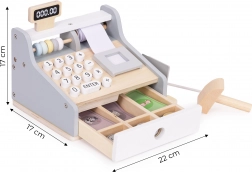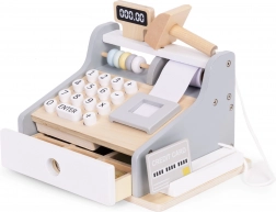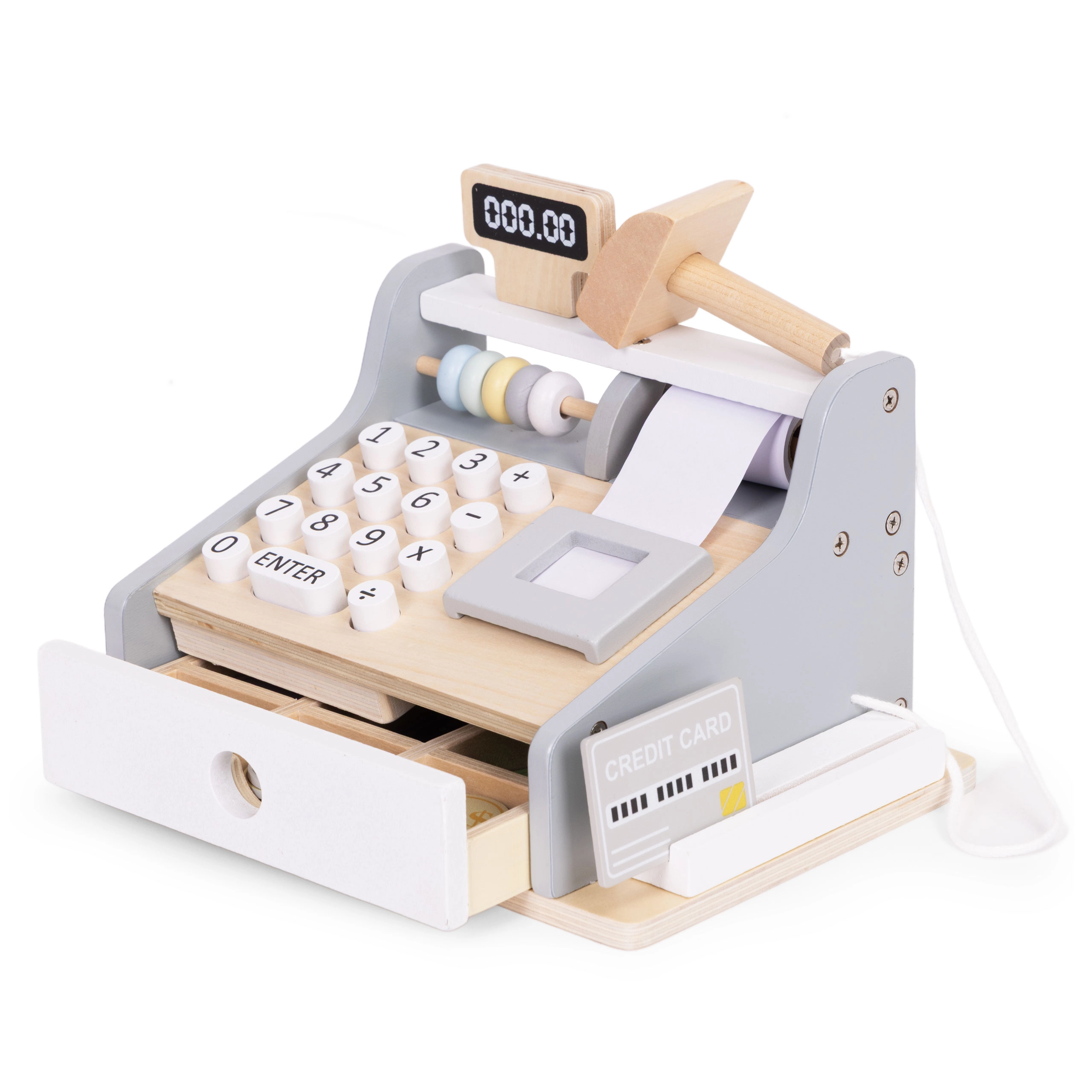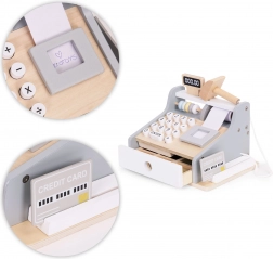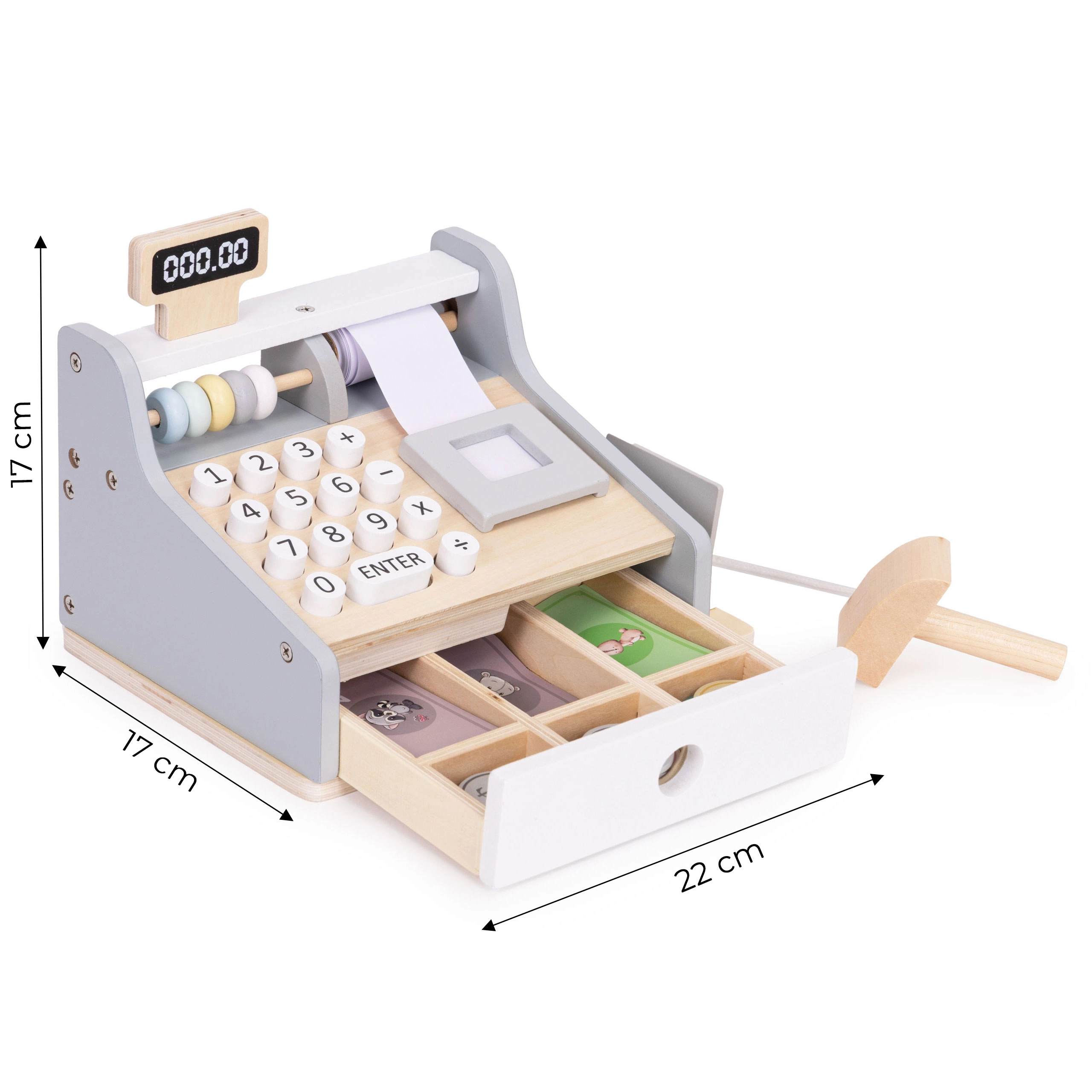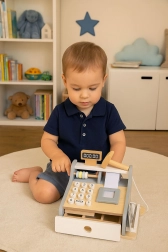 Casa de marcat pentru copii ECOTOYS, în tonuri plăcute naturale și gri, aduce tot ce au nevoie micii vânzători: tastatură numerică, afișaj, scanner, terminal de plată cu card și casă culisantă cu compartimente pentru bancnote și monede. Construcția durabilă din lemn cu margini rotunjite asigură un joc în siguranță.