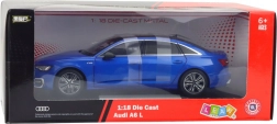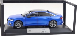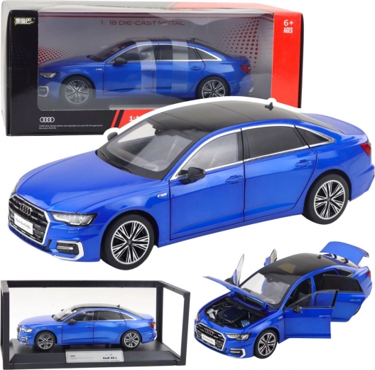 - model AUDI A6 L 1:18 (albastru), cheie pentru roți, triunghi reflectorizant, instrument pentru deschiderea ușilor