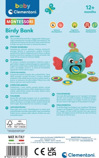 Drăguță pușculiță montessori în formă de păsărică CLEMENTONI BABY. Materiale sigure, golire ușoară, ideală pentru dezvoltarea alfabetizării financiare și ca idee de cadou.