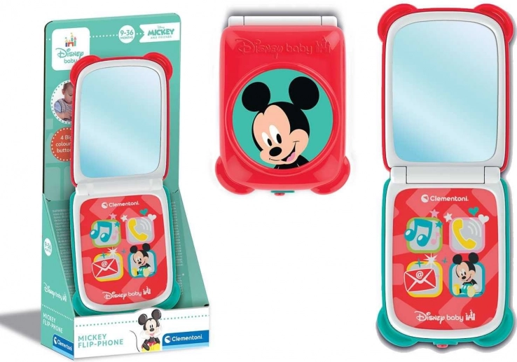 Clementoni Baby Mickey smartphone pliabil pentru copii 9–36 luni. 4 butoane luminoase, ecran oglindă, susține motricitatea. Baterii incluse.