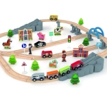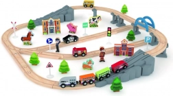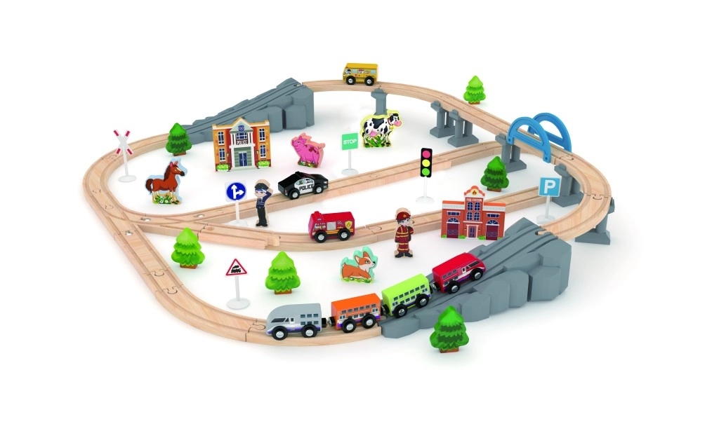 Sunt incluse locomotiva, vagoanele, șinele și accesorii tematice care stimulează jocul de rol. Lemnul natural asigură stabilitate și durabilitate, iar marginile netede și finisarea sigură oferă confort și încredere în timpul jocului.
