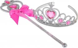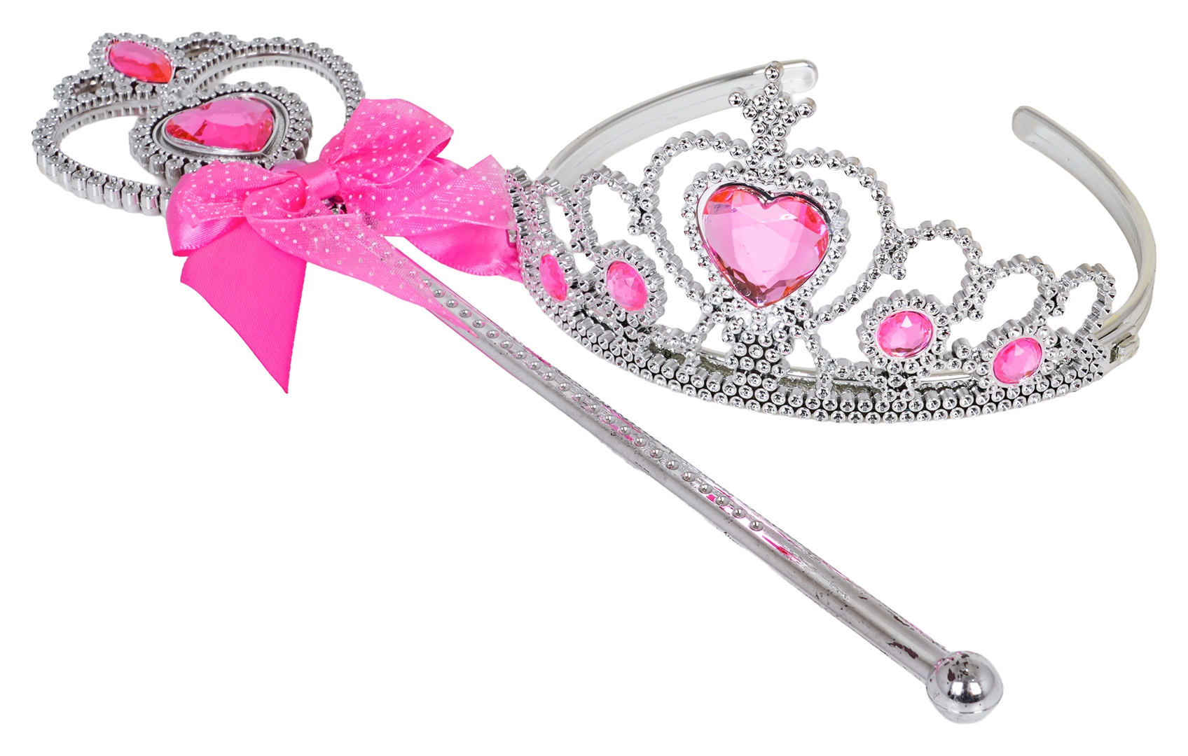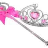 Coroană argintie cu pietricele roz și baghetă asortată conferă costumului un aer regal și stimulează imaginația în jocurile de rol.