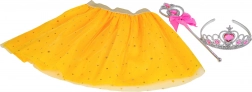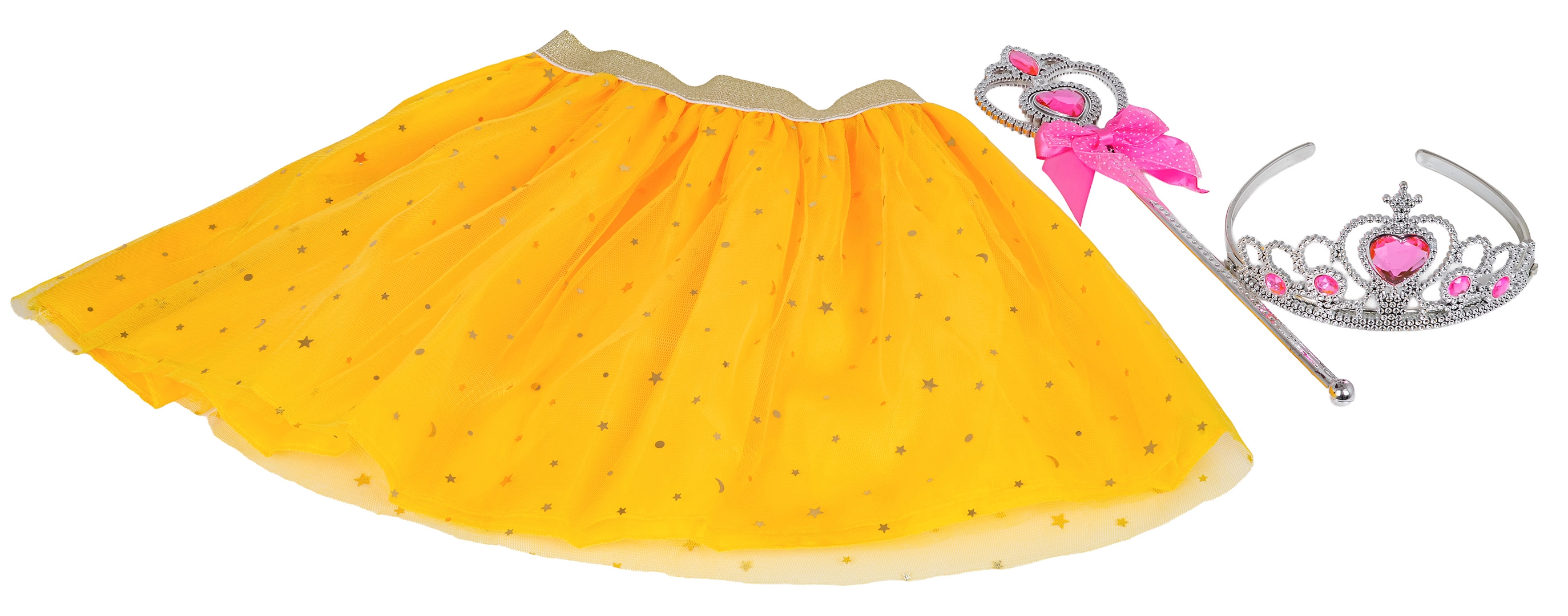 Transformă fiecare zi într-o poveste cu acest set magic pentru micile prințese. Include aripi mari de fluture cu lumini și muzică, o fustă tutu galbenă sclipitoare, o coroană argintie și o baghetă magică. Datorită bretelelor ajustabile aripile stau bine pe spate, efectele de lumină și sunet încântă, iar fusta ușoară cu steluțe sclipitoare asigură confort la purtare. Ideal pentru carnaval, spectacole și jocuri de fantezie acasă. Aripile oferă mai multe moduri de fluturare și iluminare și sunt alimentate de 4× AA 1,5 V (nu sunt incluse).