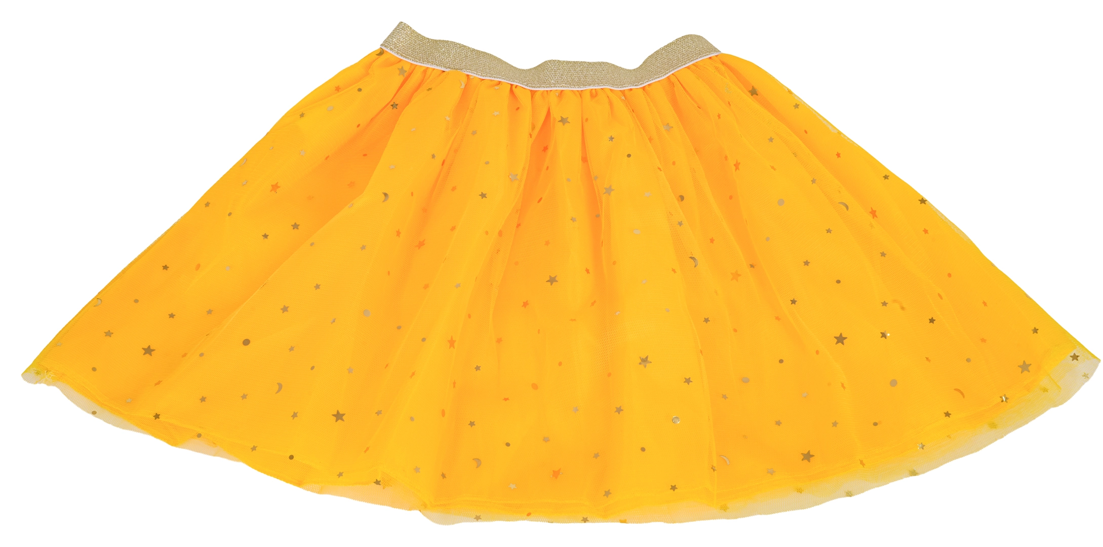 Fustă ușoară din tulle cu sclipici și talie elastică, se adaptează perfect și permite libertate de mișcare la dans și joacă.