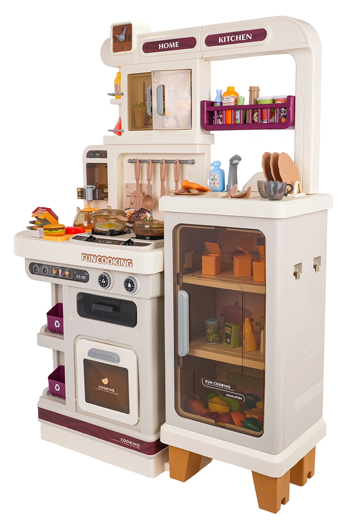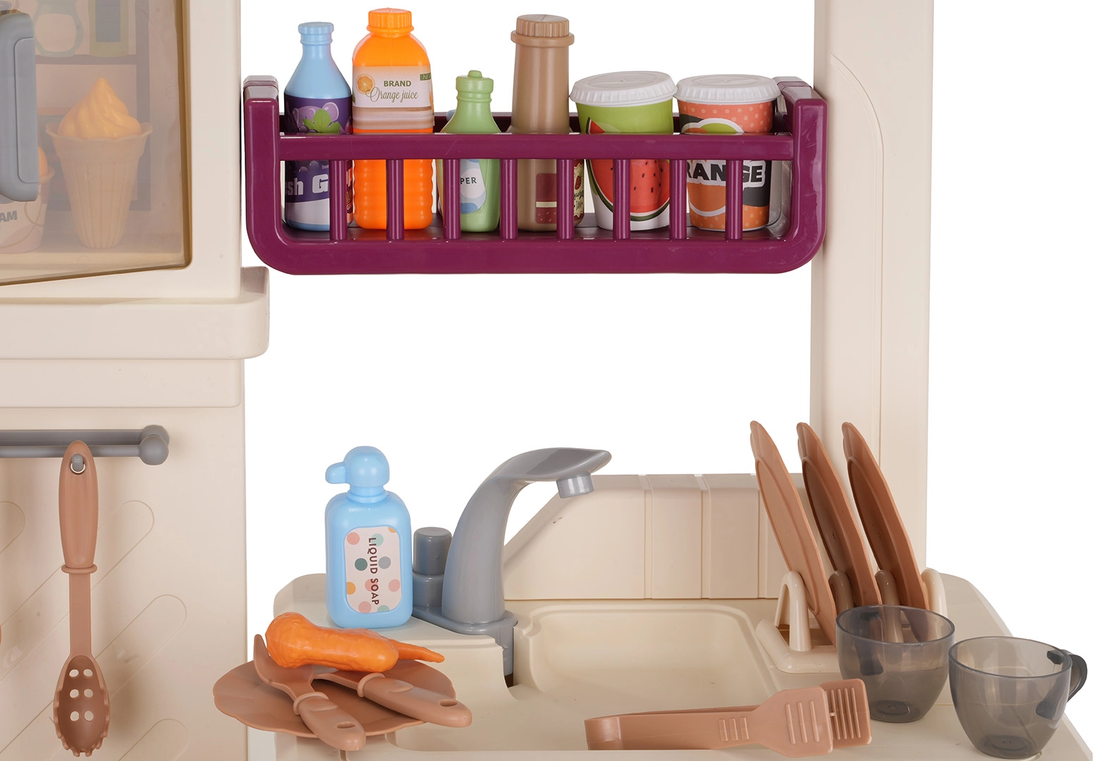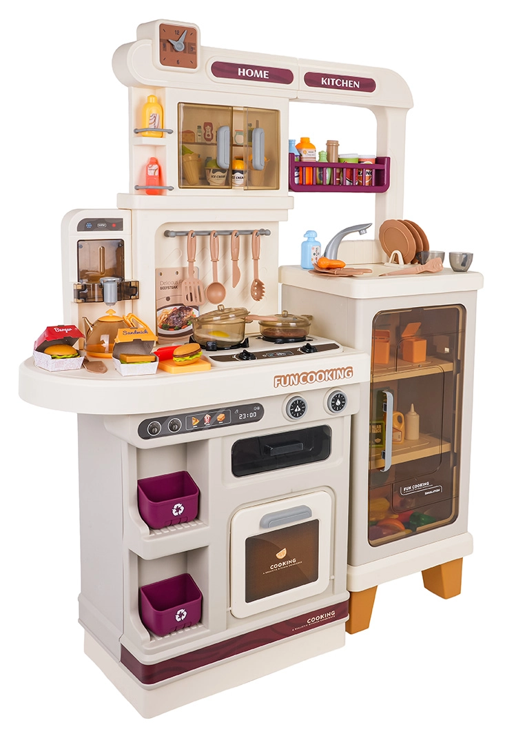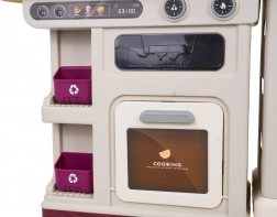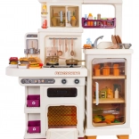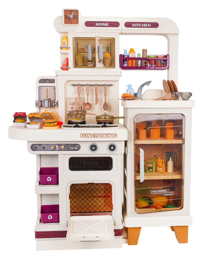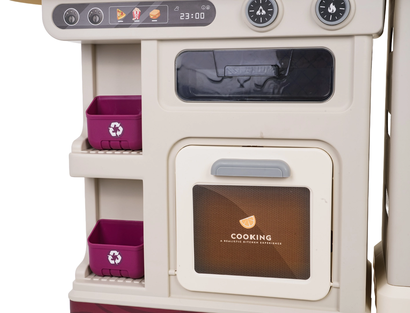 Această bucătărie multifuncțională, într-o elegantă culoare bej, este fabricată din plastic de calitate, rezistent, și îi va încânta pe cei mici prin funcțiile realiste. Arzătoarele iluminate redau sunete de gătit și prăjit, dintr-un arzător se ridică abur fin, iar din robinetul funcțional curge apă. Cuptorul și frigiderul cu uși, împreună cu rafturile și cârligele, păstrează toate accesoriile organizate la locul lor.