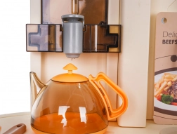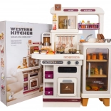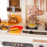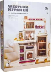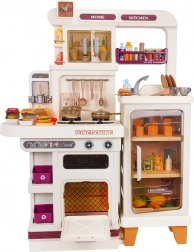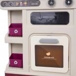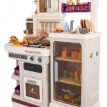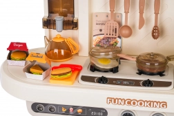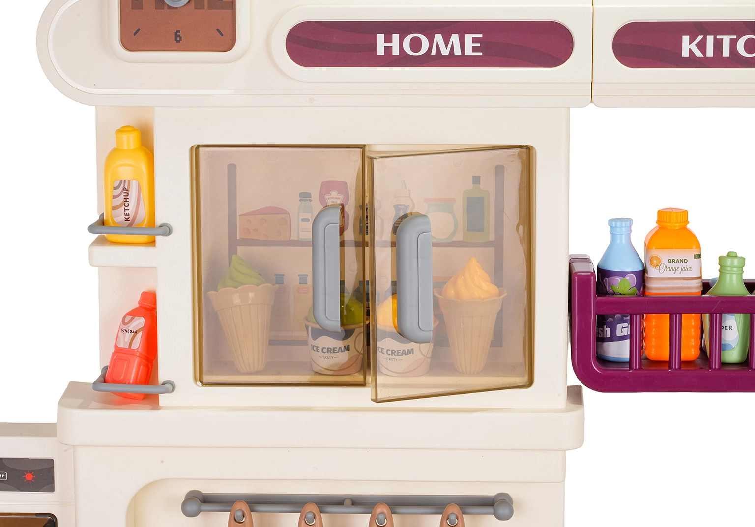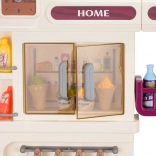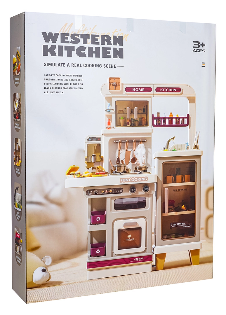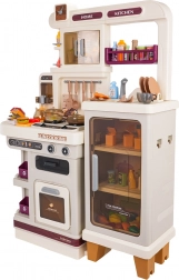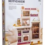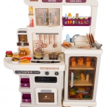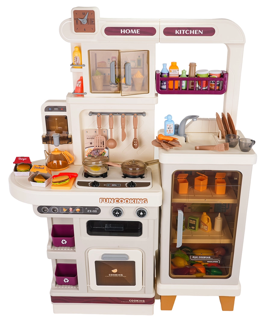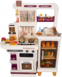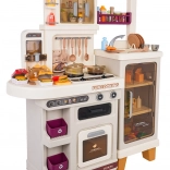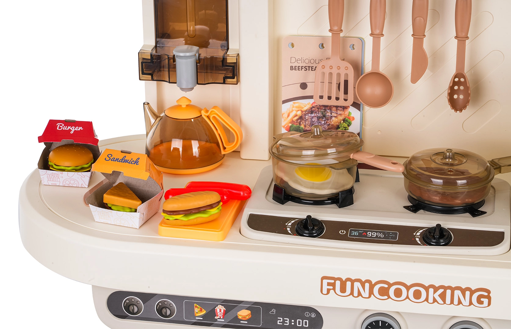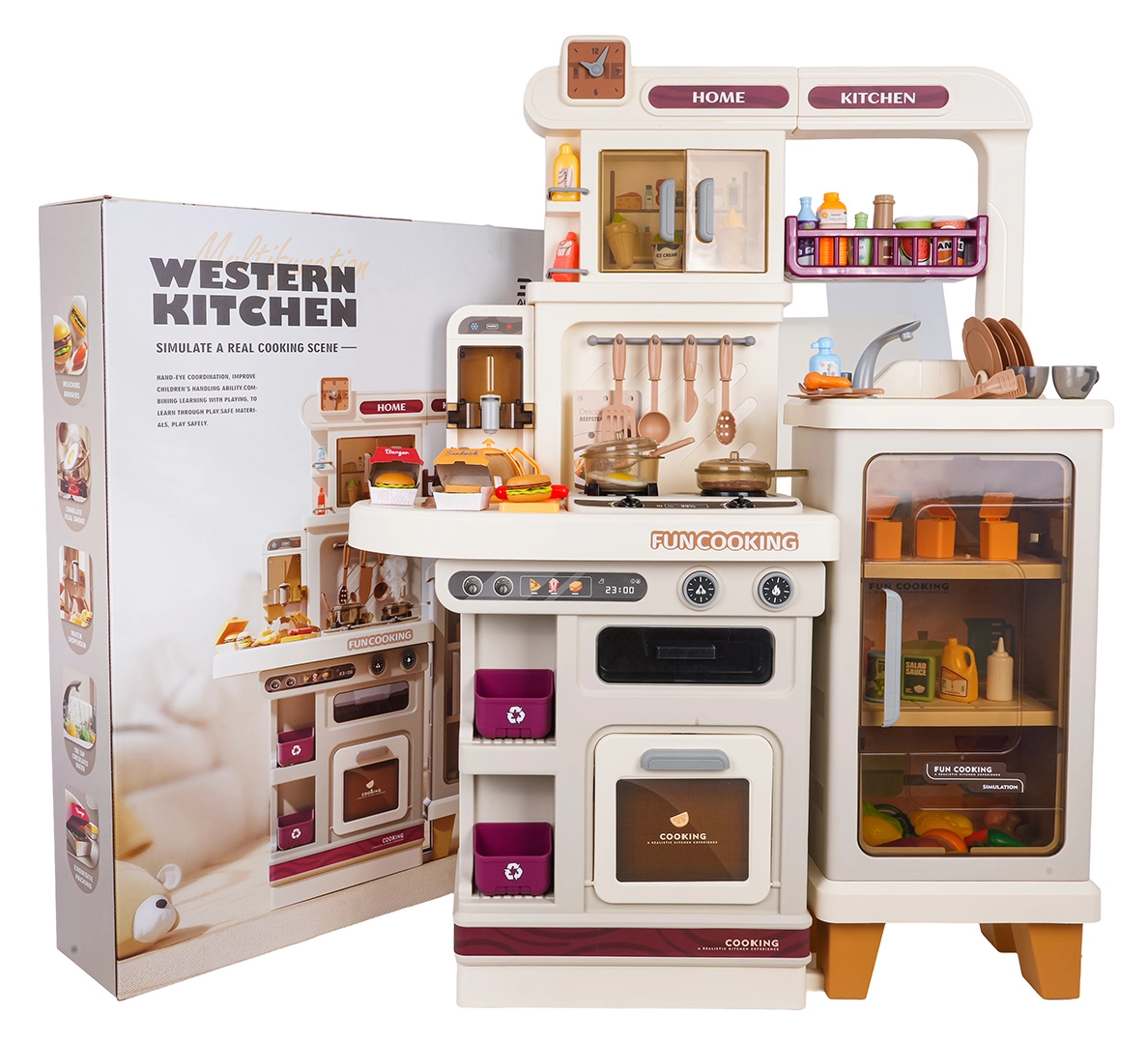 Această bucătărie multifuncțională, într-o elegantă culoare bej, este fabricată din plastic de calitate, rezistent, și îi va încânta pe cei mici prin funcțiile realiste. Arzătoarele iluminate redau sunete de gătit și prăjit, dintr-un arzător se ridică abur fin, iar din robinetul funcțional curge apă. Cuptorul și frigiderul cu uși, împreună cu rafturile și cârligele, păstrează toate accesoriile organizate la locul lor.