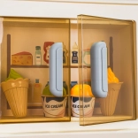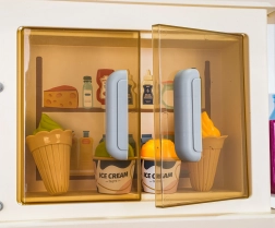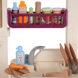 Din robinet curge apă reală, în timp ce frigiderul, cuptorul, dulapurile și rafturile găzduiesc toate accesoriile și mențin colțul de joacă ordonat.