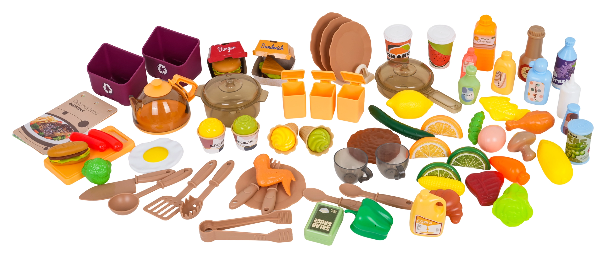 În pachet găsiți 93 de piese – oale, tigaie, ceainic, veselă, tacâmuri, ustensile de bucătărie, recipiente pentru condimente, coșuri de gunoi, precum și o selecție bogată de alimente și băuturi. Nu lipsesc ceasul cu ace mobile și cardurile de meniu pentru o și mai mare doză de imaginație. Bucătăria este ideală pentru dezvoltarea motricității fine, a abilităților sociale și a jocului creativ.