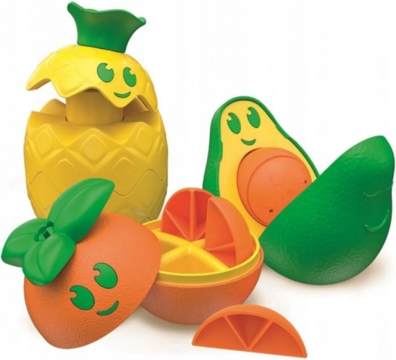 Acest set creativ cu trei tipuri de fructe este conceput pentru micii exploratori. Fiecare fruct oferă un mod diferit de joacă: avocado se deschide și ascunde în interior o bilă detașabilă, părțile ananasului pot fi asamblate una peste alta, iar portocala se împarte în 4 felii pe care copiii le reasamblează. Datorită texturilor și formelor variate, jucăria oferă stimuli senzoriali diverși.