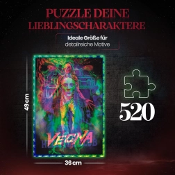 În pachet găsiți tot ce aveți nevoie pentru asamblare și expunere: puzzle de 520 piese, carton dur pentru suport, adeziv, ramă de montaj din plastic, modul electronic și bandă RGB LED, precum și poster de referință și instrucțiuni. După asamblare, imaginea are dimensiunea de aproximativ 36 × 49 cm și este ideală ca decor cu efect de suprapunere a trei niveluri de culoare.