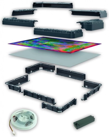 - Puzzle, carton dur, adeziv, ramă de montaj din plastic, modul electronic, bandă RGB LED, poster de referință, instrucțiuni
