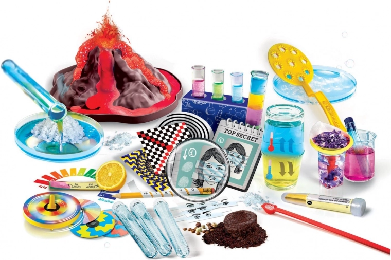 - Peste 30 de accesorii: eprubete, suport, pahare gradate, accesorii pentru optică, model de vulcan, ghiduri/carduri de activități