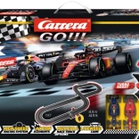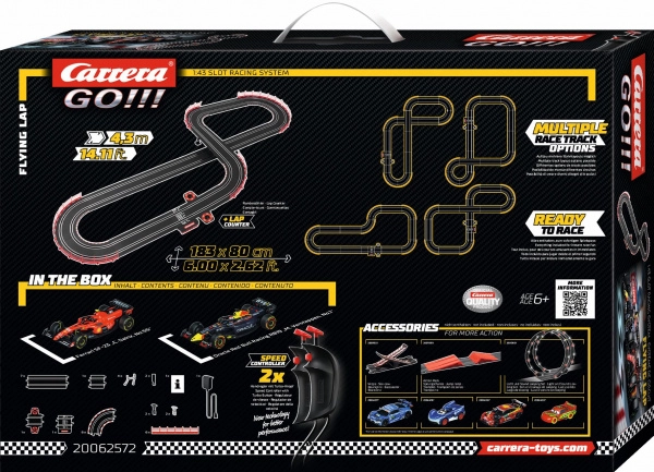 Intrați în lumea vitezei cu pista auto Carrera GO!!! Flying Lap. Cu dimensiuni asamblate de 183 × 80 cm și un traseu proiectat inteligent cu pod, oferă curse dinamice între două icoane ale Formulei 1 – FERRARI SF-23 „C. Sainz” și RED BULL RACING RB19 „M. Verstappen”. Sistemul analog cu contor mecanic de tururi și controlere cu funcție Turbo aduce dueluri palpitante roată la roată.