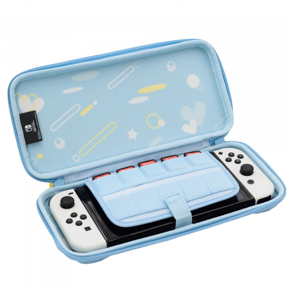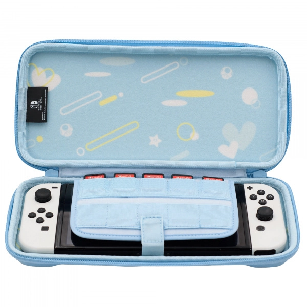 Interiorul complet acoperit protejează consola împotriva zgârieturilor și șocurilor, în timp ce suportul pentru carduri de joc găzduiește până la 10 titluri, astfel încât biblioteca ta să fie mereu la îndemână. Designul cu ilustrații ale prințesei Peach la interior și exterior, completat de fermoare cu steluțe din universul Super Mario, conferă husei un stil jucăuș.