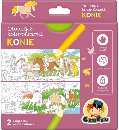Acest set original CZUCZU îi poartă pe copii în lumea cailor și a vieții din grajd. Pe o parte îi așteaptă desene de colorat de mari dimensiuni, iar pe cealaltă sarcini adecvate vârstei și ghicitori pentru preșcolari. Ilustrațiile sunt pline de umor și detalii care stimulează imaginația și concentrarea.