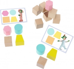Set educațional din lemn pentru cei mai mici cu 15 cuburi colorate și cartonașe cu personajele BOBAŚKI I MIŚ de la Trefl. Copiii asociază formele corecte cu cardurile, dezvoltând motricitatea fină, clasificarea formelor și gândirea logică. Execuție sigură din lemn cu vopsele netoxice și posibilitatea de a combina cu alte seturi O! Klocki.
