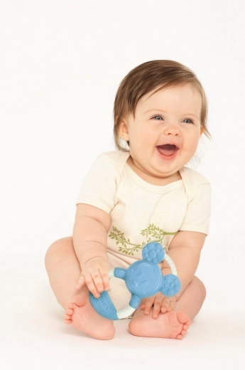 Suprafața texturată a jucăriei susține percepția senzorială și dezvoltarea motricității fine. Forma ergonomică, cu prindere sigură, motivează copilul să o țină singur și să exploreze în siguranță.