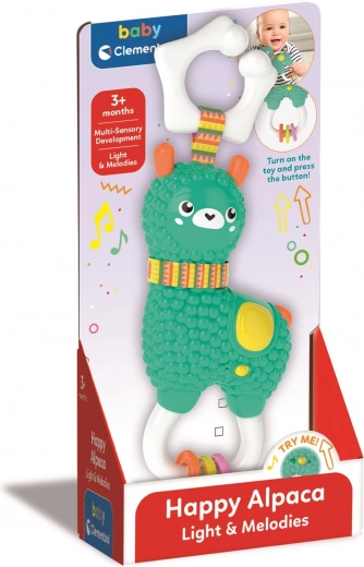 Această zornăitoare interactivă adorabilă în formă de alpaca de la BABY CLEMENTONI îi va încânta pe bebelușii de la 3 luni. Oferă un buton iluminat cu melodii și efecte sonore, pandantive colorate și texturi variate pentru dezvoltarea simțurilor. Datorită inelului practic, o puteți fixa ușor pe pătuț, cărucior sau scaun auto.