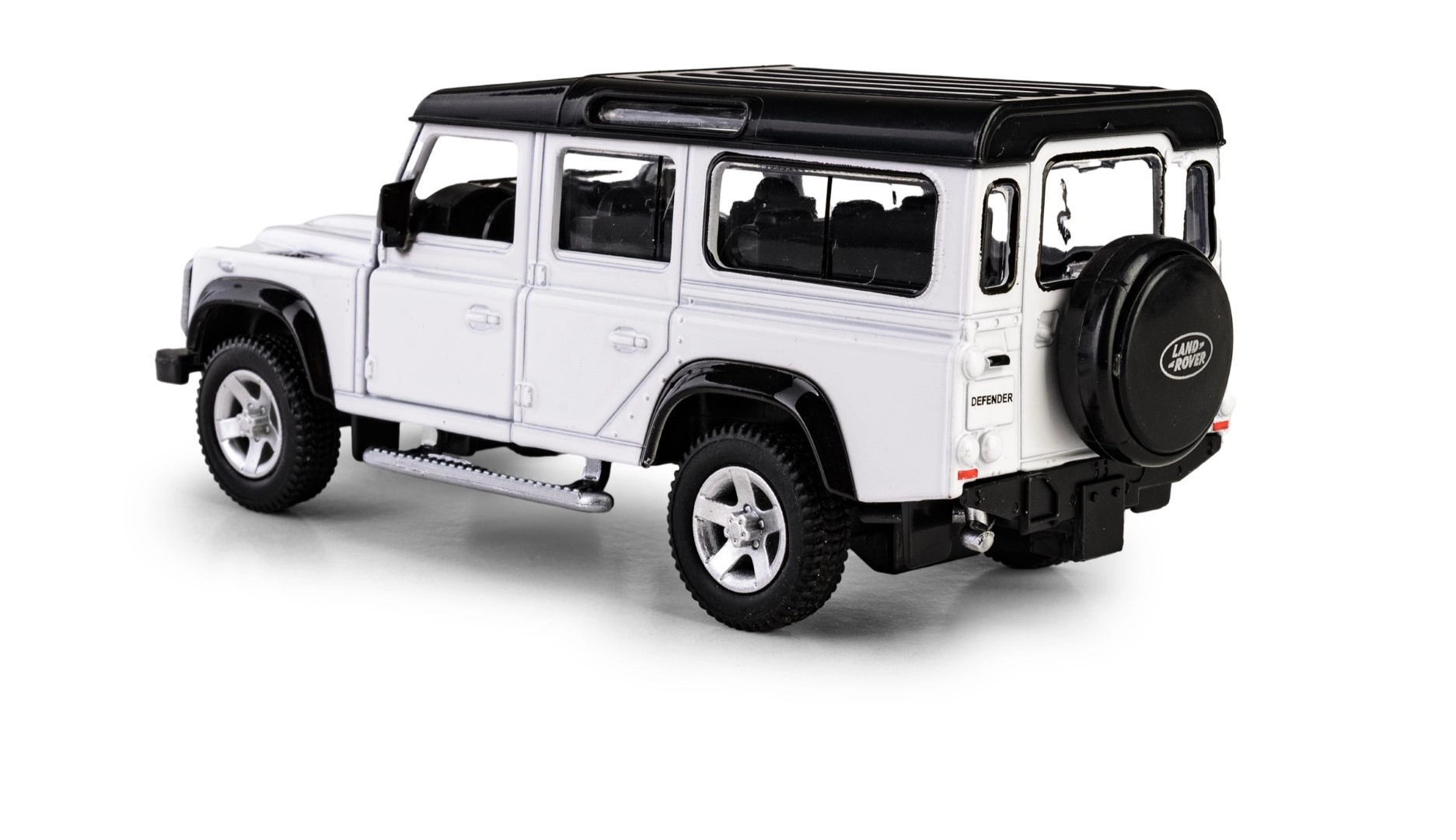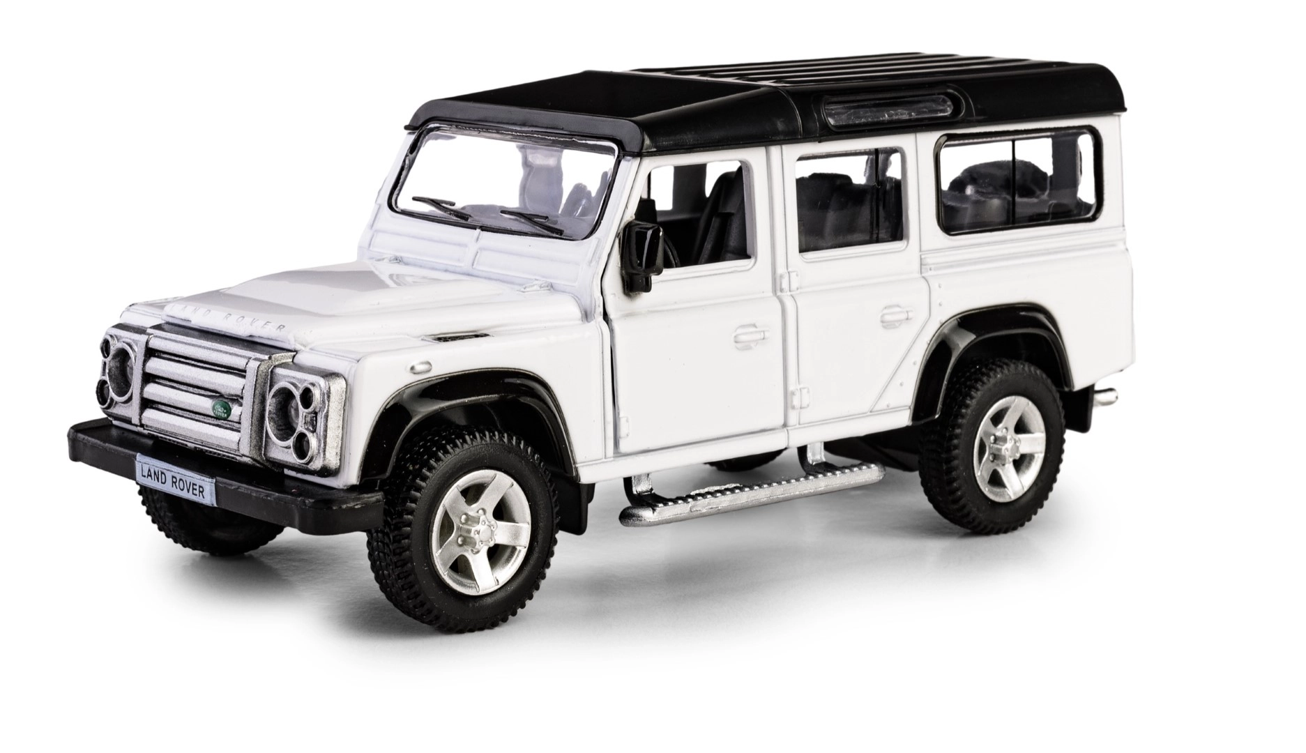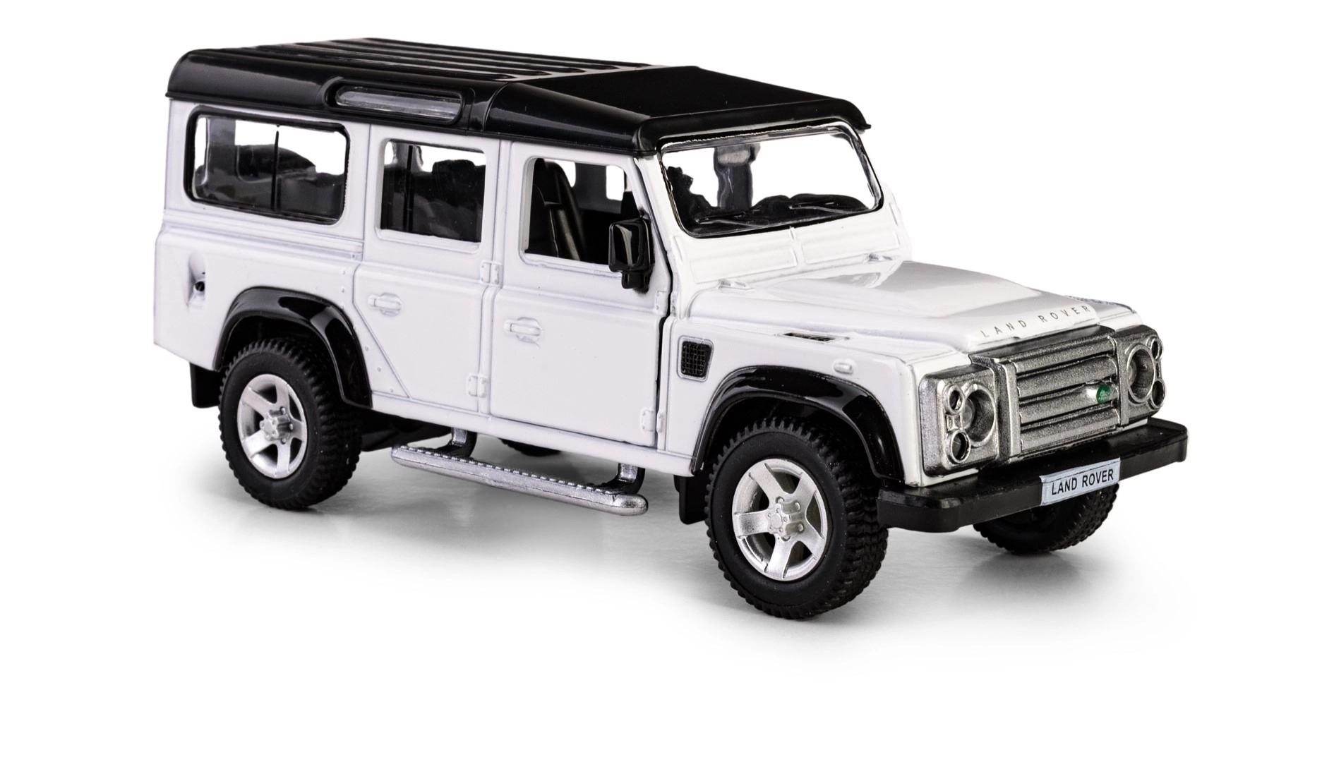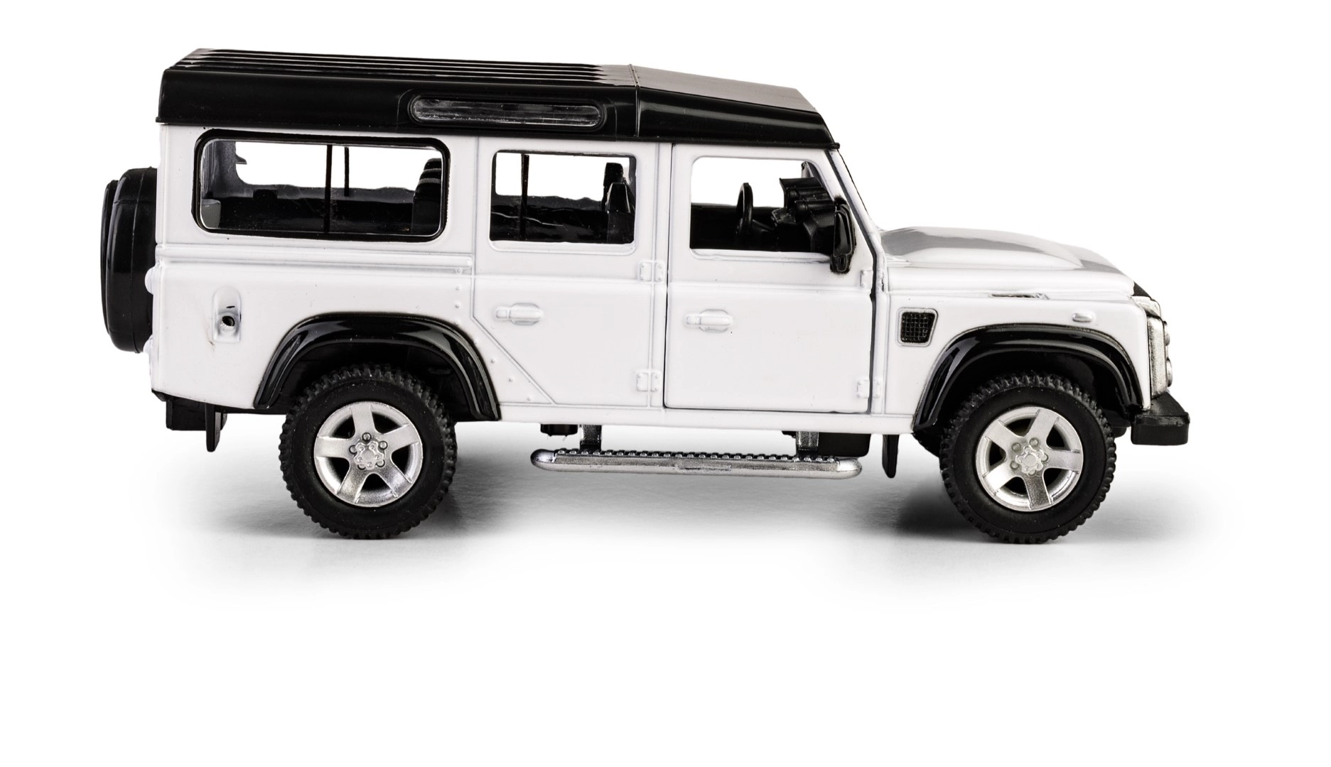 Acest model fidel al legendarului off-road impresionează prin execuția metalică precisă cu detalii din plastic și aspect autentic în culoare albă cu acoperiș negru în contrast. Datorită ușilor care se deschid, puteți arunca ușor o privire în interiorul realizat cu atenție.