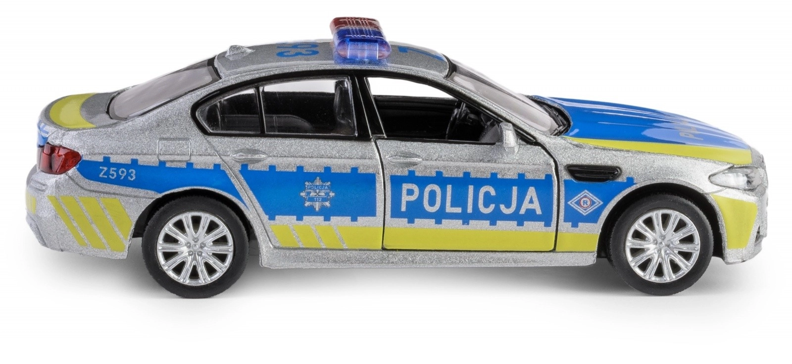Descoperiți replica detaliată BMW M5 în variantă de poliție, care se remarcă prin caroserie metalică, execuție precisă a interiorului și elemente funcționale. Modelul la scară 1:32 este echipat cu mecanism pull-back practic – trageți înapoi și vehiculul pornește înainte.