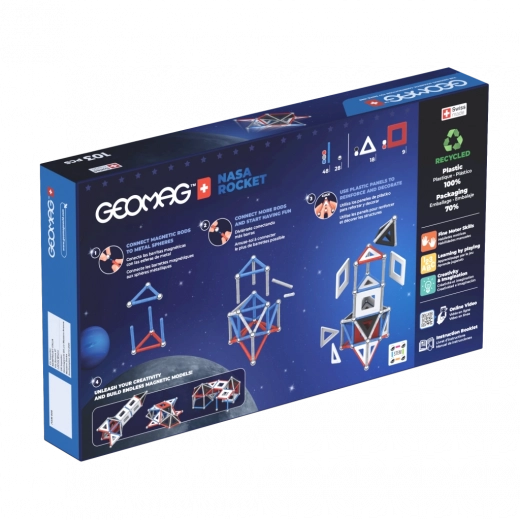 Această ediție limitată a setului magnetic GEOMAG, realizată în colaborare cu NASA, îi va încânta pe micii și marii pasionați de spațiu. Datorită magneților puternici, cadrelor ușoare și îmbinărilor metalice, veți asambla cu ușurință racheta, modulul lunar și construcții fanteziste. Piesele rezistente și conexiunile inteligente garantează stabilitatea modelelor și o joacă lină.