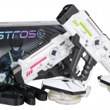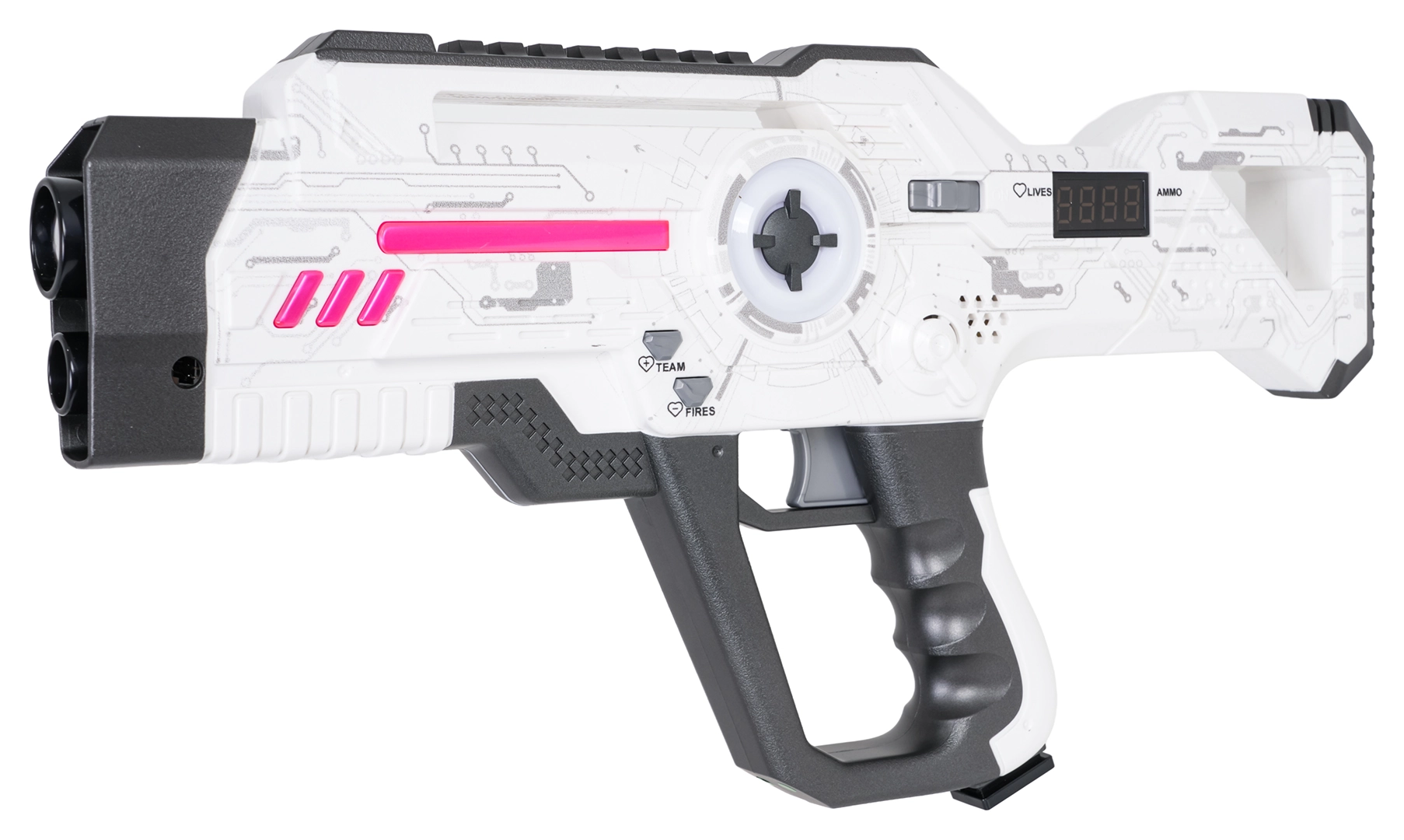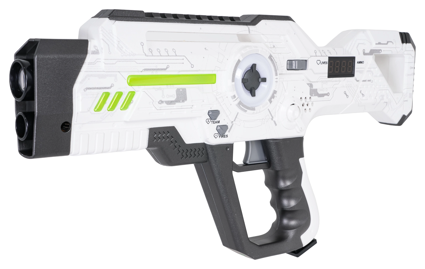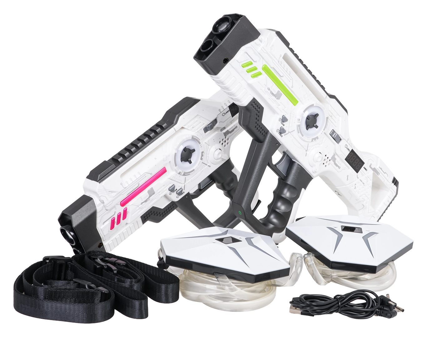 Alegeți culoarea echipei (portocaliu, albastru, roșu, verde) și comutați între moduri: trăgător cu un singur foc, pușcă laser, mitralieră și pușcă cu plasmă. Bretelele iluminate îmbunătățesc vizibilitatea în amurg, iar instrucțiunile vocale mențin ritmul jocului. Raza de tragere este de până la 60 m pe întuneric. Este inclus un cablu de încărcare USB cu patru conectori pentru încărcarea comodă a tuturor dispozitivelor simultan.