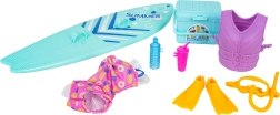 - 4 păpuși (mama, tata, fiica, bebeluș), placă de surf, vestă de salvare, labe de înot, mască/set de oxigen, costume de baie, ladă frigorifică, 2 sticluțe/pahare pentru băuturi, colac de înot