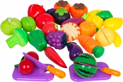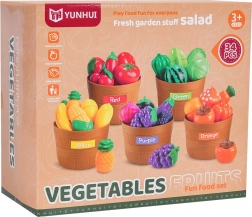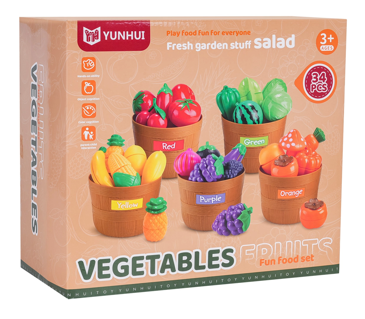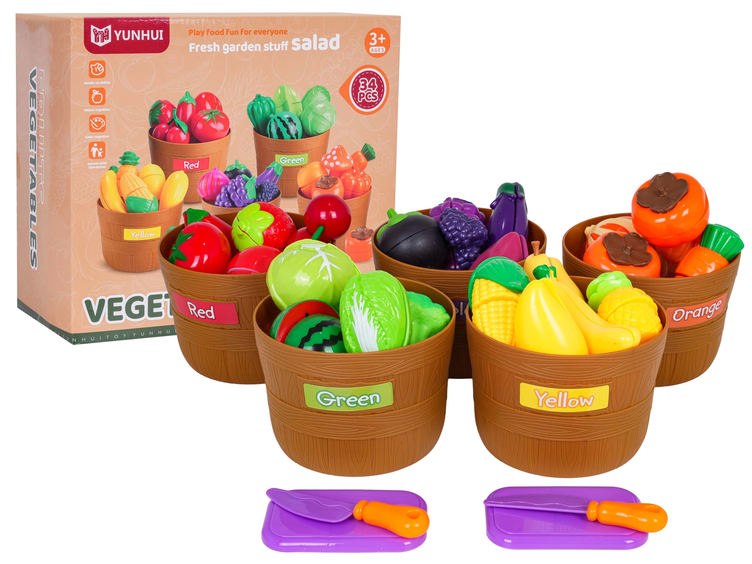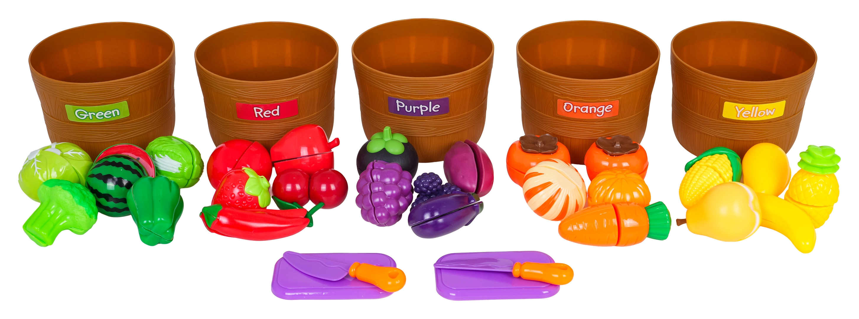 Descoperă un set didactic de fructe și legume pentru copii de la 3 ani. Setul include 34 de piese, inclusiv fructe și legume cu prindere cu arici pentru „tăiere”, 5 coșuri pentru sortare pe culori și 2 tocătoare cu cuțite. Plastic de calitate, în culori vii, dezvoltă motricitatea fină, învățarea culorilor și susține jocul creativ de bucătărie.