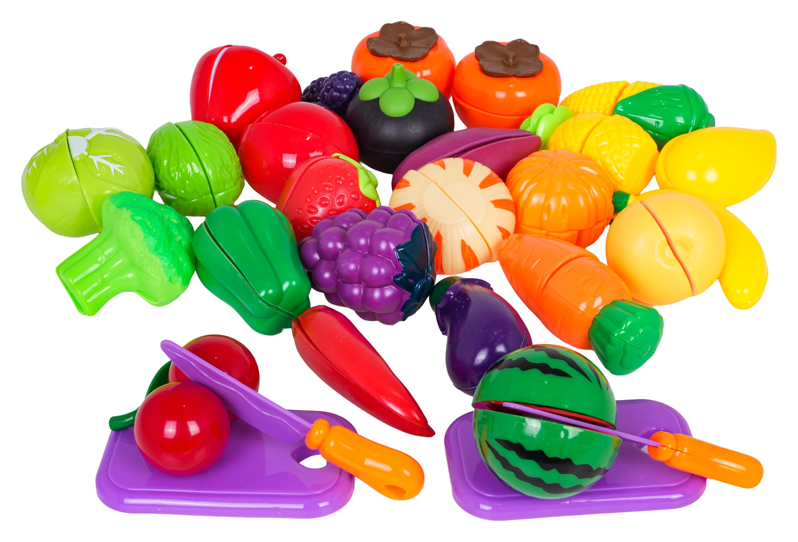 - Fructe și legume realiste: banană, lămâie, porumb, ananas, roșie, căpșună, morcov, vânătă, salată, ardei și altele