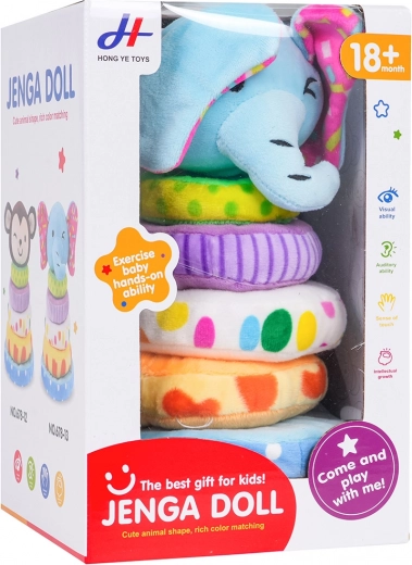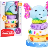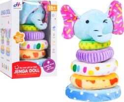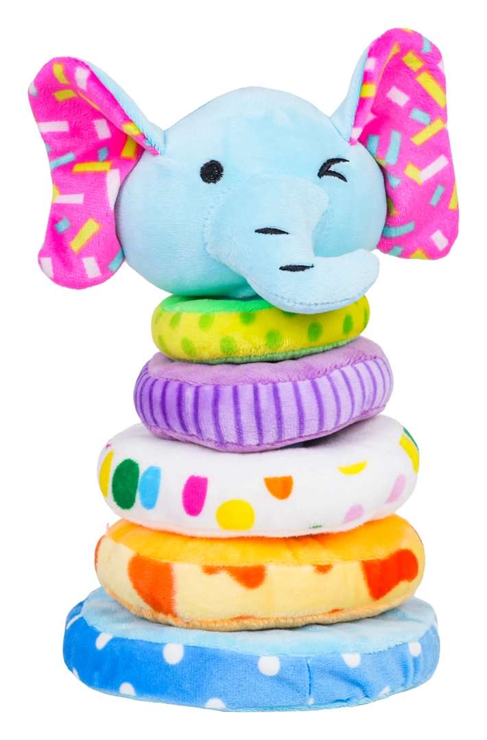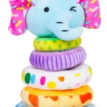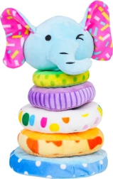 Jucărie drăguță și sigură pentru copii de la 18 luni: piramidă moale pliabilă cu elefant din pluș plăcut. Susține motricitatea fină, coordonarea mână-ochi, recunoașterea culorilor și mărimilor și, datorită capului de elefant cu pârâitoare integrată, îi motivează pe cei mici să descopere. Culorile și modelele vii atrag atenția, iar construcția moale este ideală pentru joacă în siguranță.