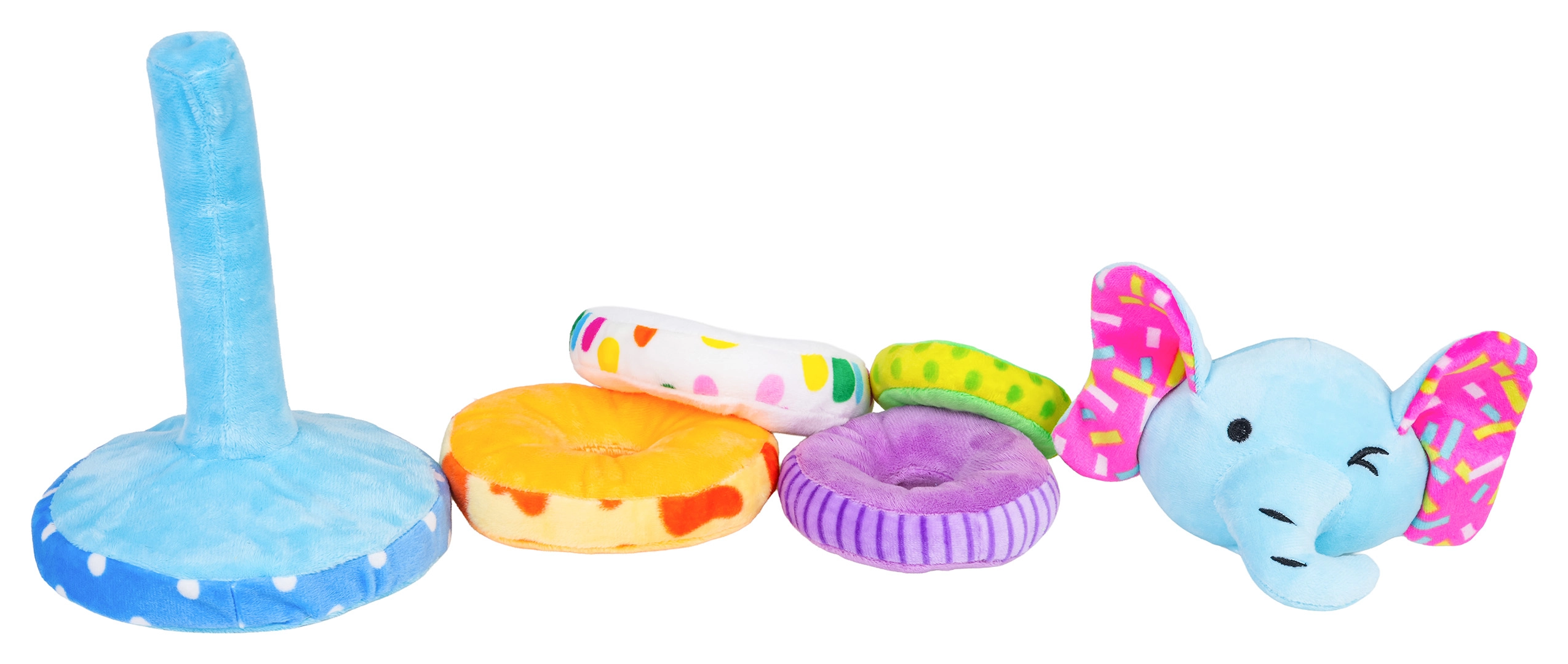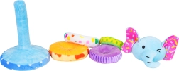 - Conținutul pachetului: bază moale cu țăruș, 4 inele din pluș, cap de elefant detașabil cu pârâitoare