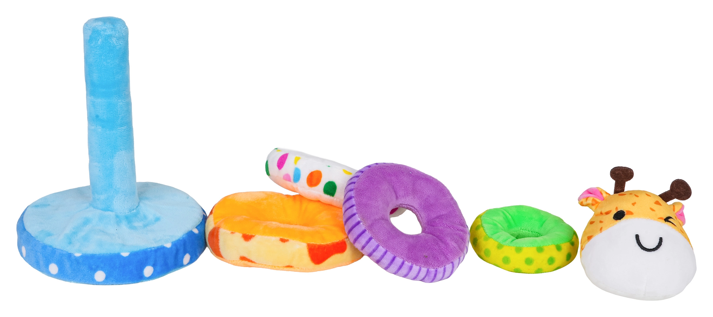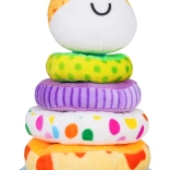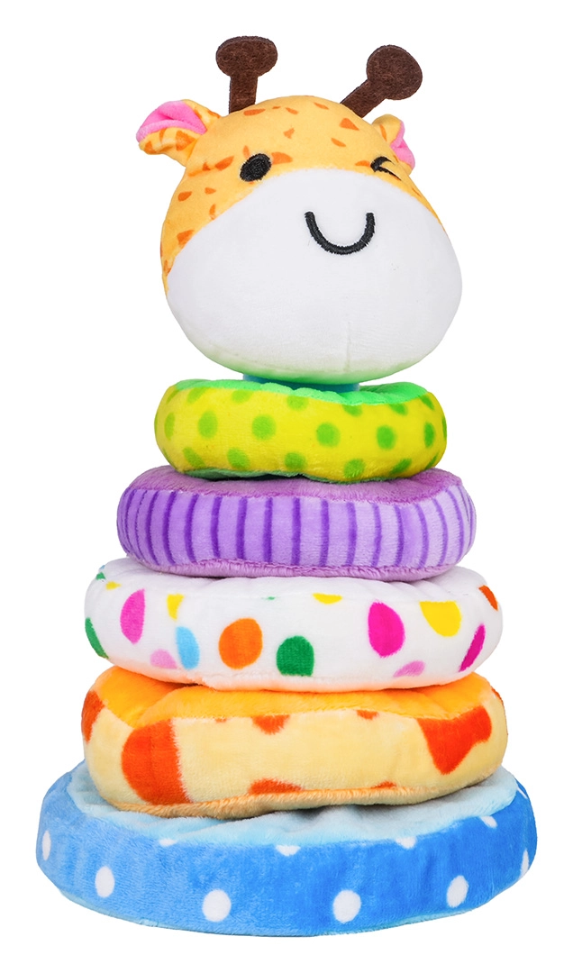 Adorabila piramidă moale în formă de girafă dezvoltă motricitatea fină, coordonarea mână–ochi și învățarea sortării după mărime. Inelele colorate și moi din pluș invită la atingere și joc sigur. În capul girafei este ascuns un fluieraș, care la apăsare scoate sunet și stimulează percepția senzorială. Jucărie ideală pentru copii de la 18 luni.