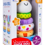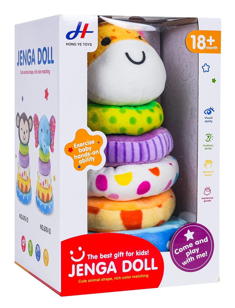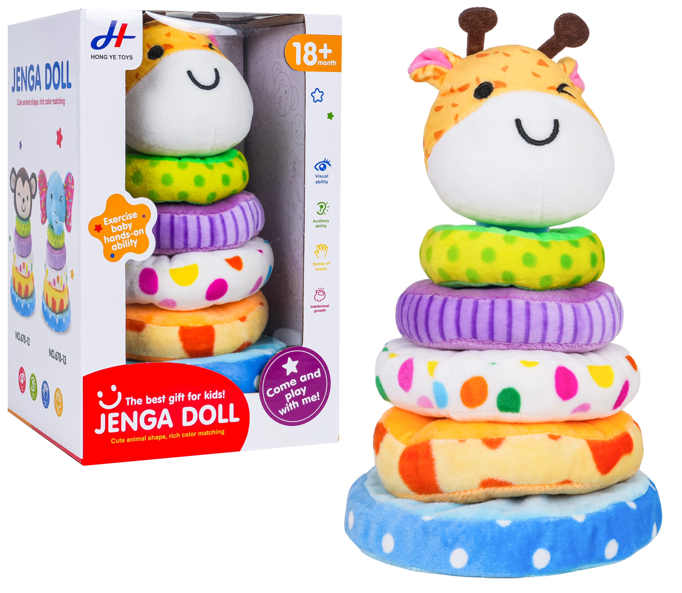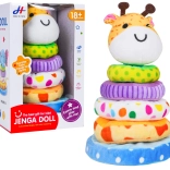 Piramida moale stivuibilă girafă oferă copiilor o formă distractivă și sigură de învățare. Setul include o bază stabilă, patru inele catifelate de mărimi diferite și capul girafei cu fluieraș. Modelele viu colorate și plușul plăcut susțin dezvoltarea senzorială, în timp ce stivuirea inelelor antrenează logica și răbdarea.