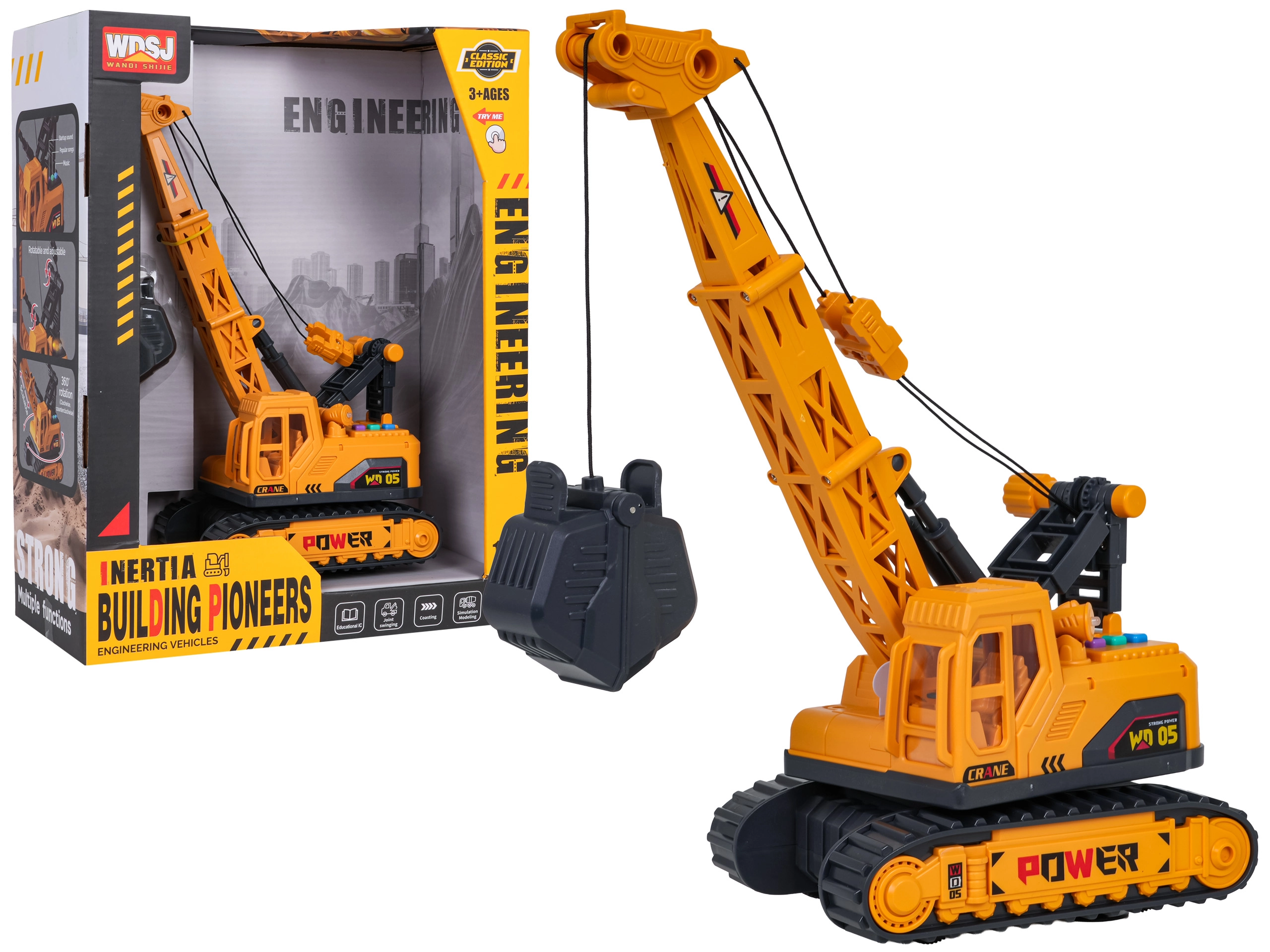 - Ridicare/coborâre manuală a brațului și cleștilor, bază rotativă 360°, efecte luminoase și sonore, acționare cu rotițe mici