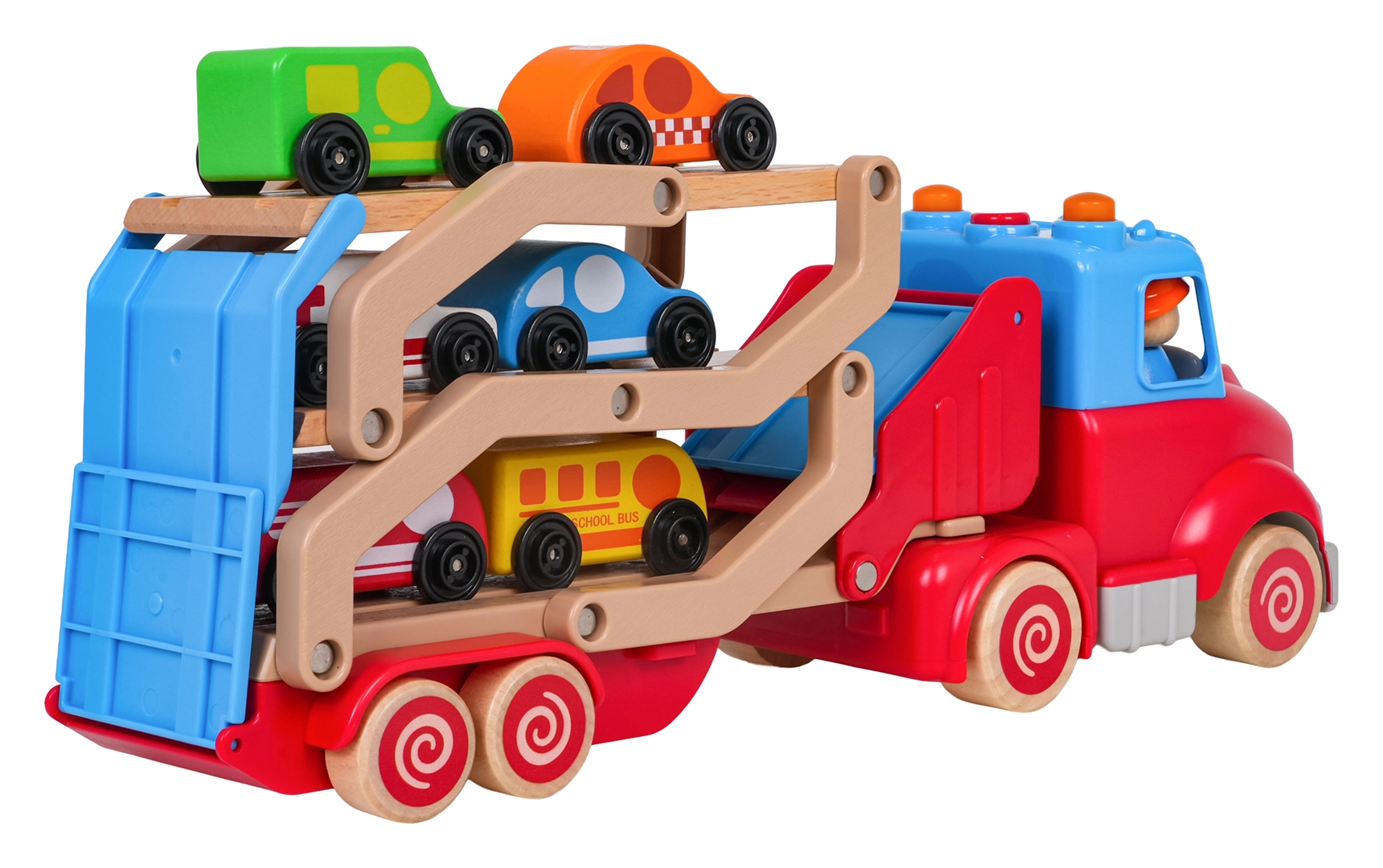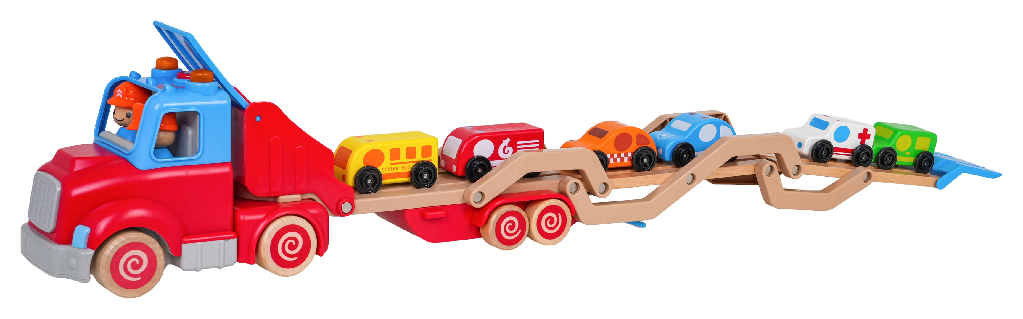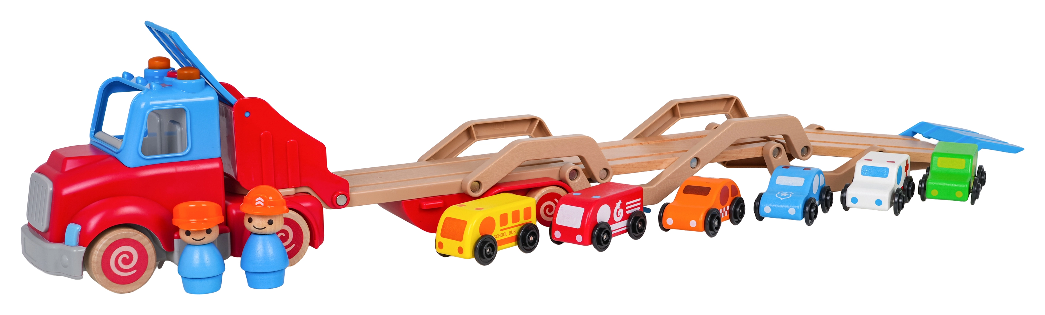 Acest camion din lemn cu rampă de tractare sprijină motricitatea fină, coordonarea și imaginația. Datorită culorilor vii și elementelor funcționale – rampă ce se ridică și se rabatează, ansamblu detașabil, roți mobile – copiii pot încărca și descărca ușor mașinuțele și își pot crea propriile povești din trafic.